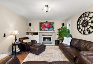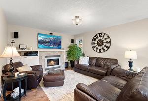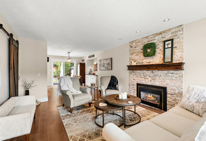 All bathrooms have been tastefully updated, as have windows, lower floor doors, and the two gas fireplaces in living and family rooms.