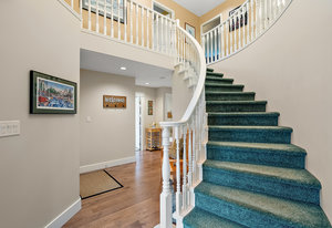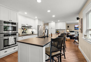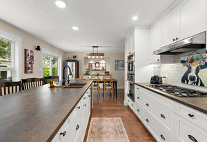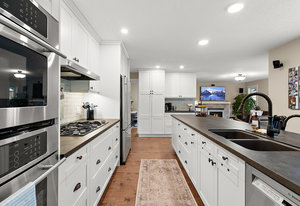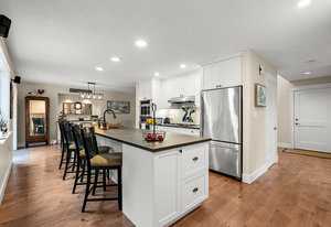 Located on a beautifully landscaped, fully fenced, and extremely private lot, and featuring many significant upgrades, such as engineered hardwood flooring, a stylish and highly functional gourmet kitchen, featuring ceramic Neolith counters, a massive island, quality stainless appliances such as a 5 element gas range, wall oven, and microwave combo, Bosch dishwasher, high quality cabinetry, and a large pantry with barn door.