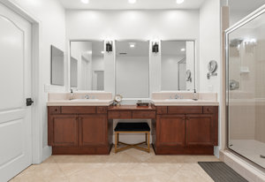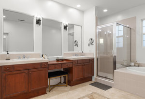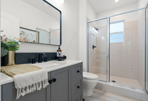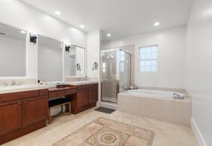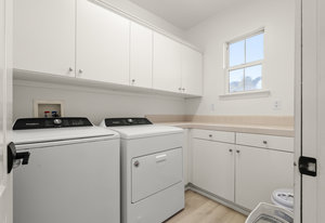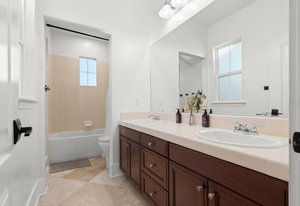 The desirable floorplan includes a roomy downstairs bedroom with a nearby full bath—ideal for guests, a home office, or multigenerational living. Upstairs, the primary suite offers peaceful backyard views, dual walk-in closets, and a spacious en-suite bath with dual vanities, a soaking tub, and a separate shower. Two additional upstairs bedrooms are filled with natural light, and the conveniently located upstairs laundry room includes ample cabinetry.