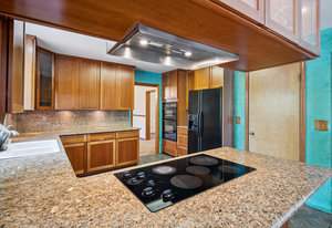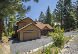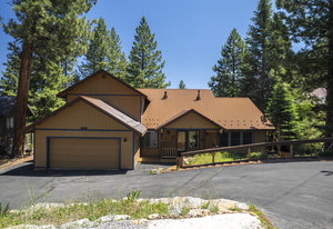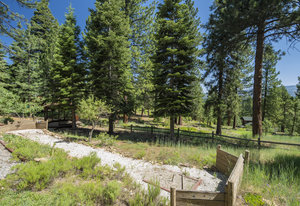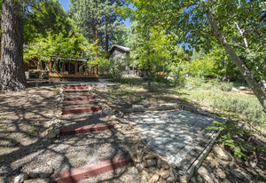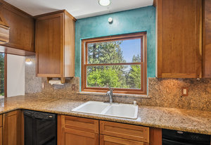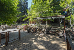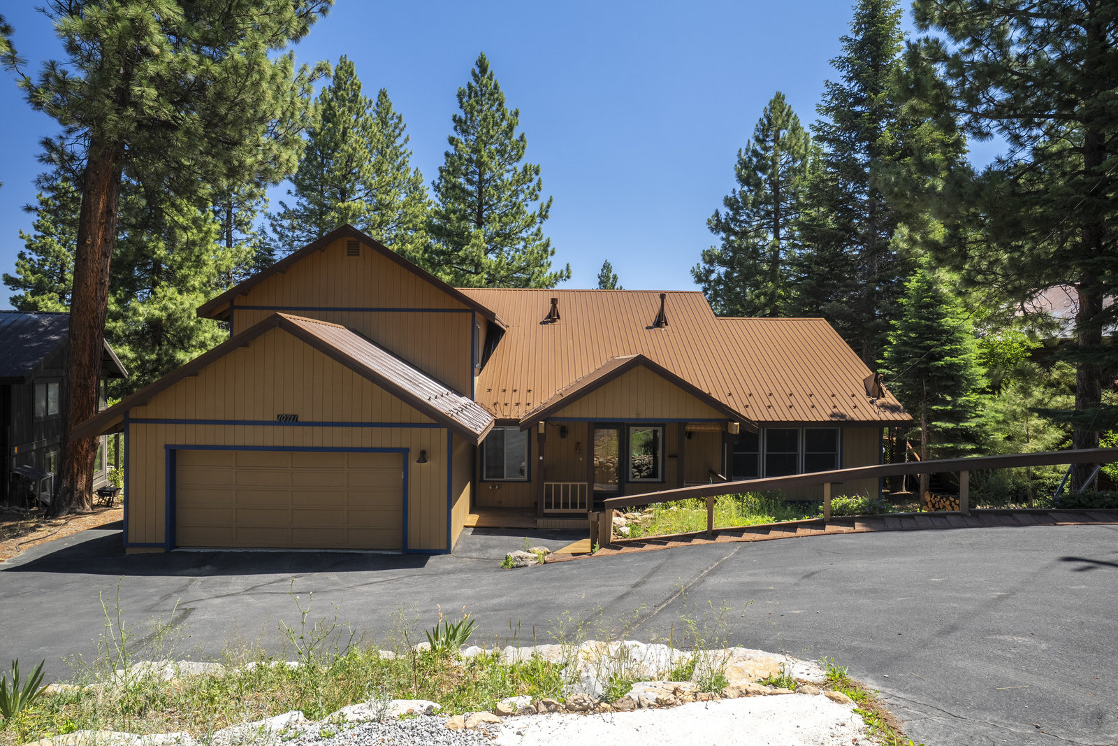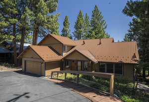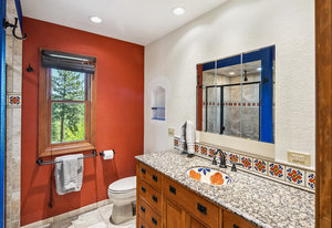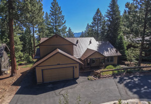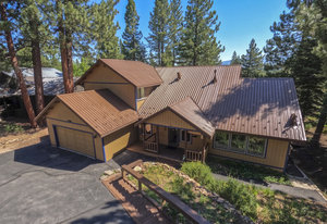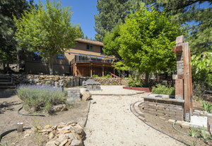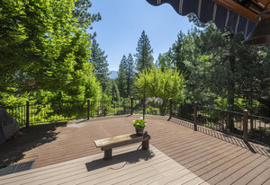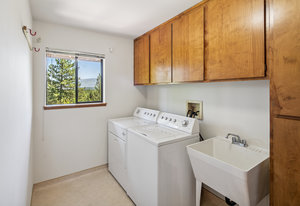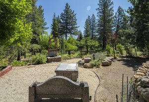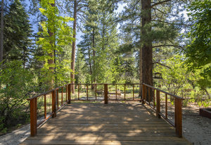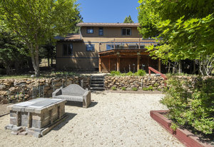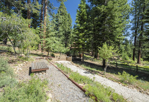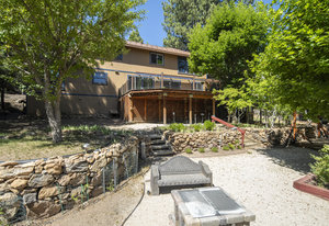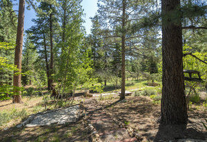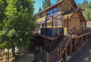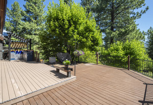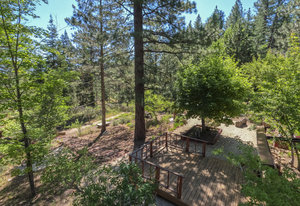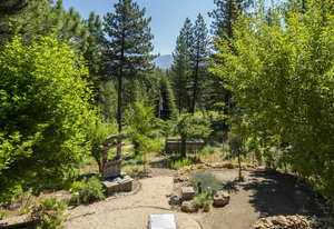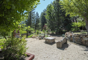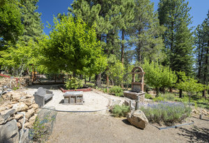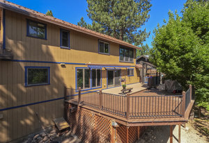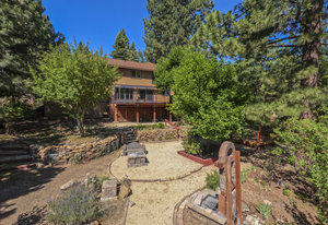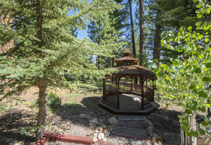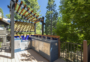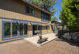 Step outside through a large sliding glass door onto the expansive rear deck, complete with a shade-providing awning and an outdoor kitchen area. The terraced backyard offers multiple places to unwind, including a private gazebo, a platform deck with a second awning, a patio, and even a horseshoe pit—perfect for enjoying Truckee summers with family and friends.