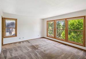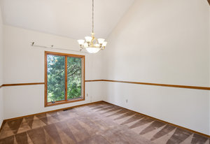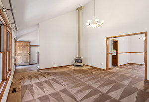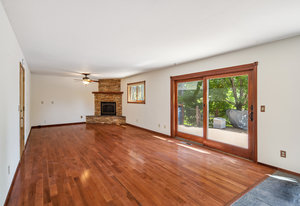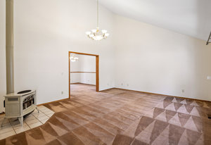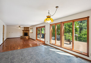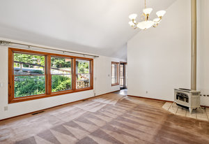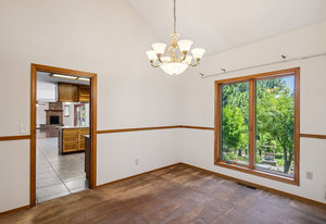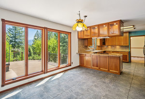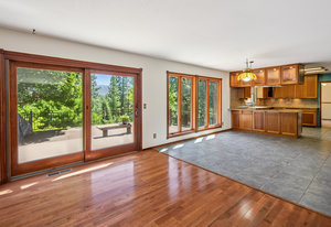 Large windows fill the home with natural light and offer peaceful views of the surrounding greenery, plus glimpses of the mountains beyond. Inside, there’s a vaulted formal living room with a cozy gas stove, a separate dining room for gatherings, a comfortable family room with a gas fireplace and stone hearth, and a spacious second dining area that's great for casual meals or game nights.