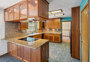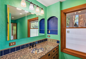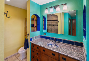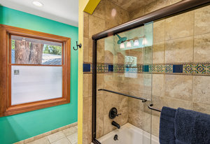 The kitchen has craftsman-style cabinets, granite counters, and tile flooring, while the bathrooms feature travertine tile and a touch of color. Wood-framed Andersen windows, fresh interior paint, and a recently tuned-up and painted roof add to the home's upgrades.