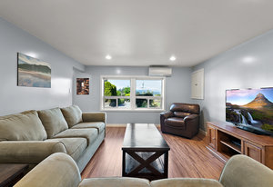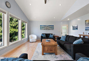 The home features soaring vaulted ceilings and expansive west-facing windows that flood the interior with natural light and capture breathtaking sunsets over the ocean. Enjoy amazing sun exposure all day long—a gardener’s dream come true. A ground-level one-bedroom, one-bathroom suite provides ideal flexibility for guests, extended family, or potential rental income. Just steps from multiple beach access points, the location invites peaceful morning walks along the shoreline.