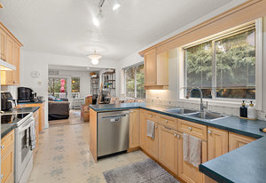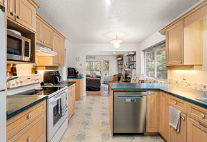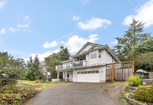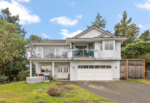 Overlooking the strait of Juan de Fuca, this spacious family home sits on a private cul-de-sac in popular Olympic View. This 6 bed, 3 bath, nearly 3000 sq/ft home has great views from most rooms & enough space for a big family PLUS an income suite! The huge low-maintenance 1/4 acre lot has natural west-coast landscaping, split log fence backing onto forest, incredible views & a path down to the brand new elementary school opening in 2025. The upper unit features 4 beds, including primary w/ 5pce jacuzzi ensuite, large kitchen, 2 living areas, 2 dining areas & 2 decks! The lower unit is a 2 bed suite w/ separate laundry & patio. Tile roof, propane fireplaces, underground utilities, ...