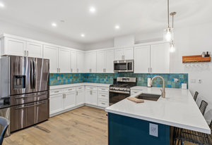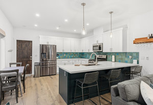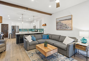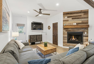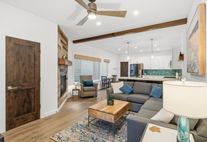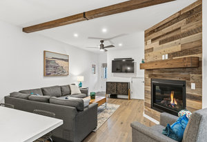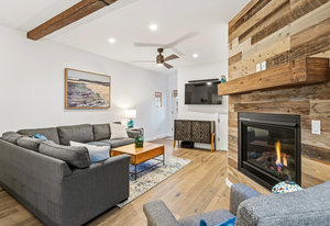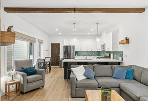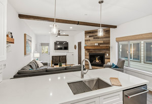 The main level opens into a bright, welcoming Great Room, an ideal space for gathering. The kitchen features a generous peninsula that doubles as the social hub, perfect for casual meals, après-ski snacks, or hosting friends. A modern gas fireplace adds warmth and ambiance, blending rustic character with a clean contemporary look.