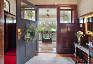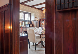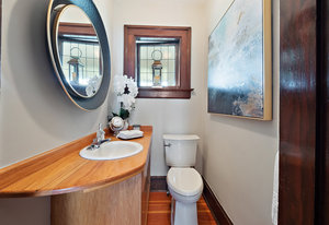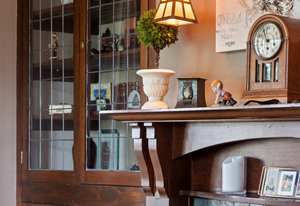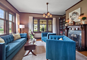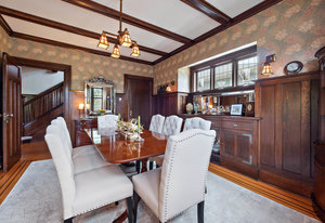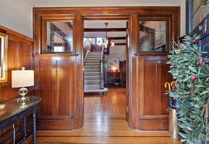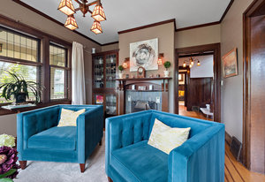 The formal living and dining rooms are separated by historic pocket doors. Built in cupboards and plate rails are featured in the dining room, the living room is kept warm and comfortable with the original tile fireplace. Original curio cabinets feature your family keepsakes.