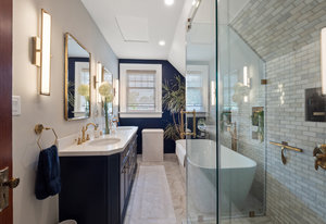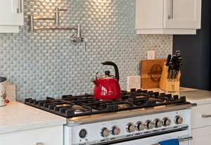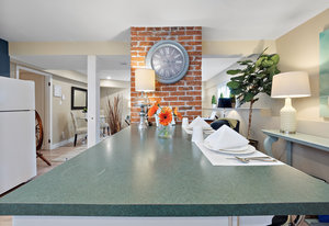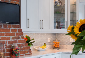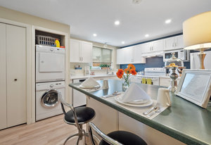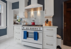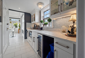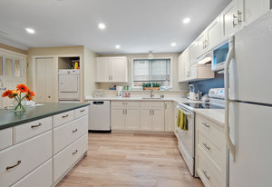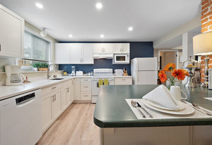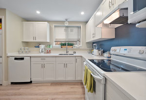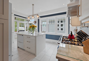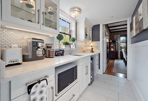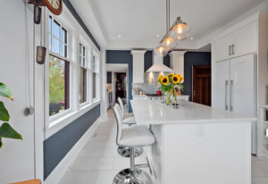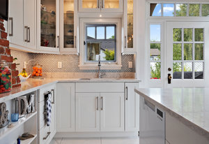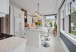The large renovated kitchen is a dream, featuring corner wrapped picture windows, quartz countertops, new fisher paykel appliances, exposed brick & pass through butlers pantry with bar sink & wine fridge. ,