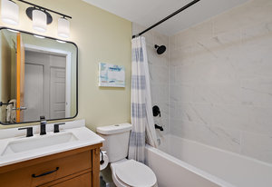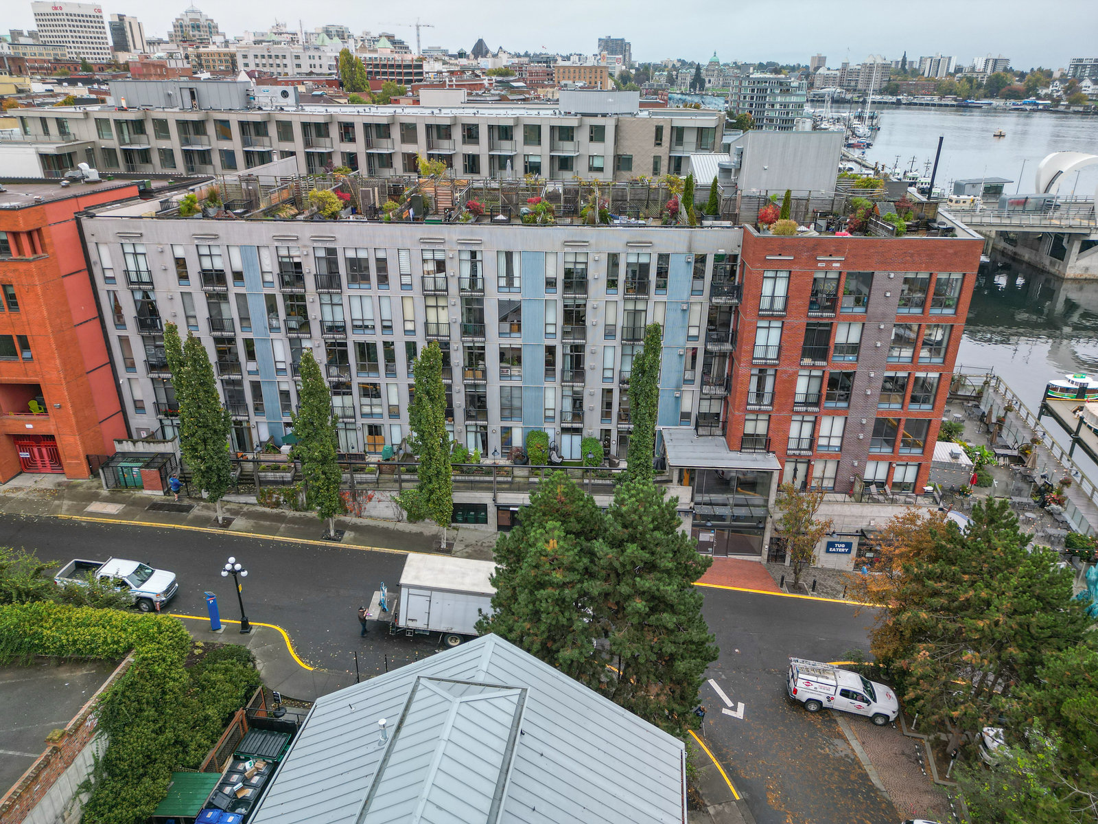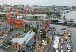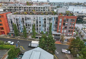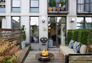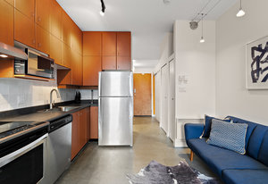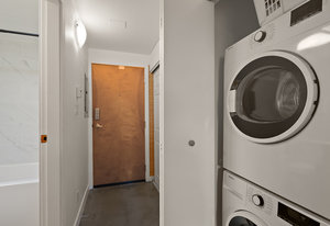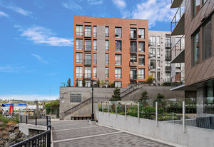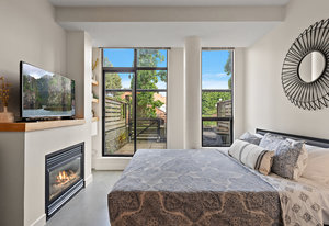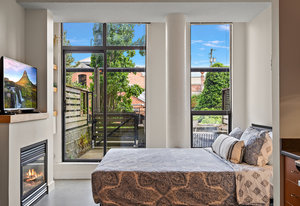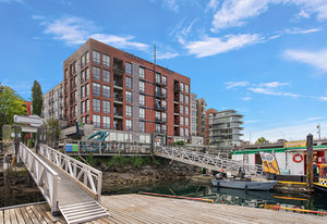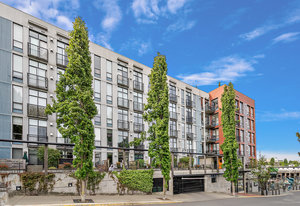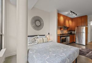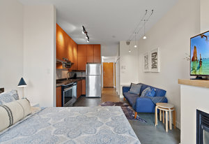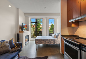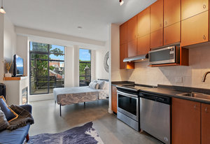 Welcome to your modern, waterfront oasis with private entrance in the exclusive Mermaid Wharf community. This distinctive ground-floor studio unit has been renovated and features a private, personal patio, polished concrete floors throughout, soaring ceilings, and floor-to-ceiling windows that maximize natural light. Amenities include an in-unit gas fireplace, ensuite laundry (brand new Blomberg washer & dryer), and a rooftop terrace with panoramic views.