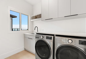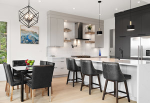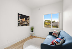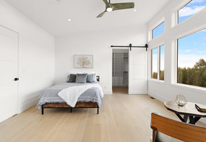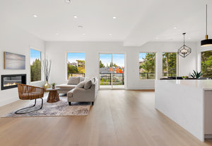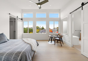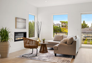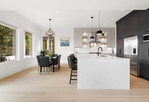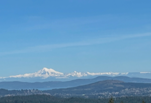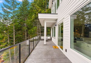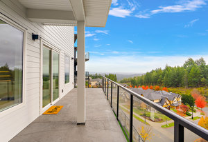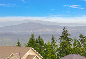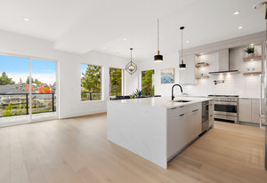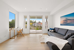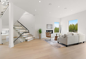 The open-concept design seamlessly connects the living spaces, with an oversized quartz kitchen island providing both a focal point and ample storage. A sliding glass door leads to the deck, inviting you to savor the tranquility and panoramic views of the mountains and distant ocean, including the majestic Olympic peaks.