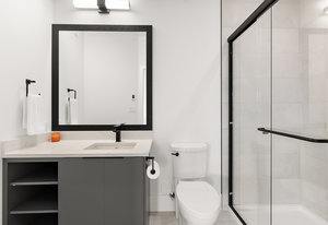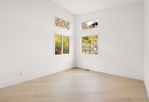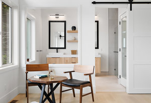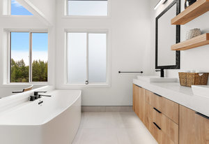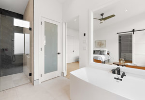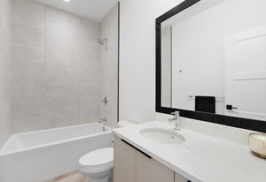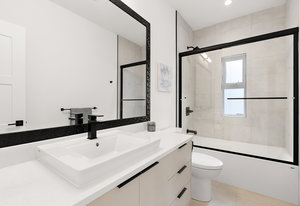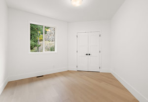 Upstairs, the primary bedroom is a sanctuary of luxury, featuring a spacious walk-in closet and a spa-inspired ensuite bathroom. Indulge in the glass-enclosed shower, soaking tub, double vanity, and water closet. The second bedroom impresses with vaulted ceilings and expansive windows, while the third bedroom provides a private retreat amidst the mature trees, evoking a woodland oasis.
