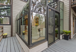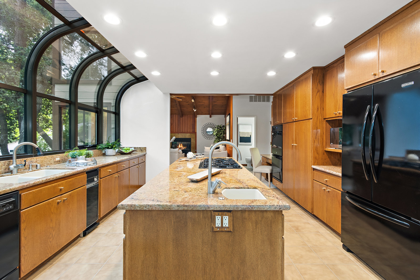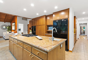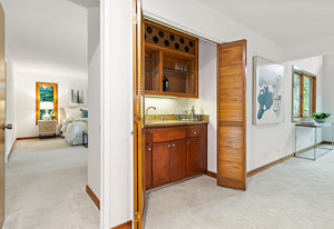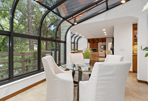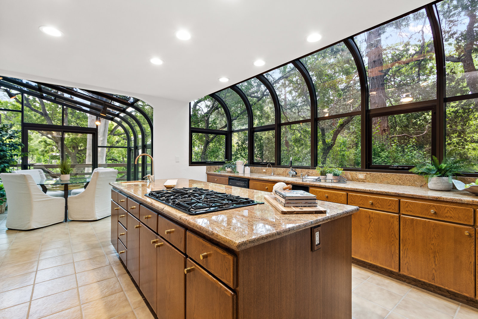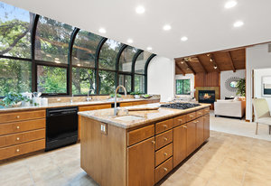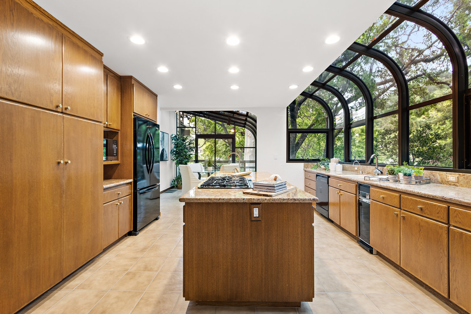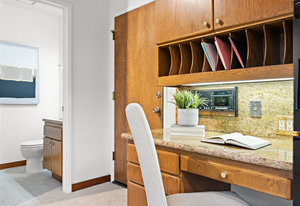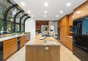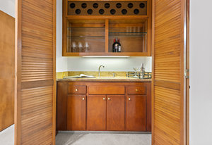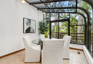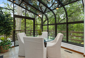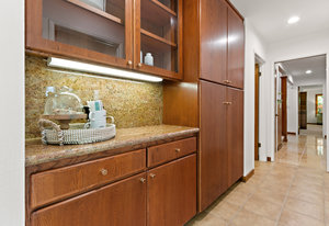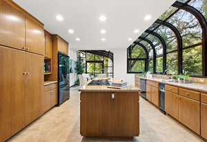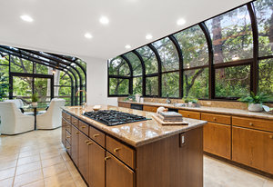 The beautiful chef’s kitchen features a serving/display/storage buffet with glass front cabinets. Atrium dining area with a slider to the outside creates a unique casual dining experience. Also features an atrium window the length of one wall for a perpetual sunny daytime experience and dramatic night time views. Amenities: double sink, dishwasher, trash compactor, and an oversized island with a five burner gas range and prep sink, as well as a refrigerator, microwave, double ovens in the wall, tile floor, granite countertops, and a planning/work desk with plentiful organization aids.