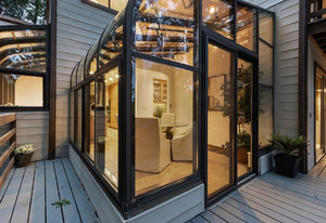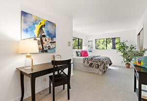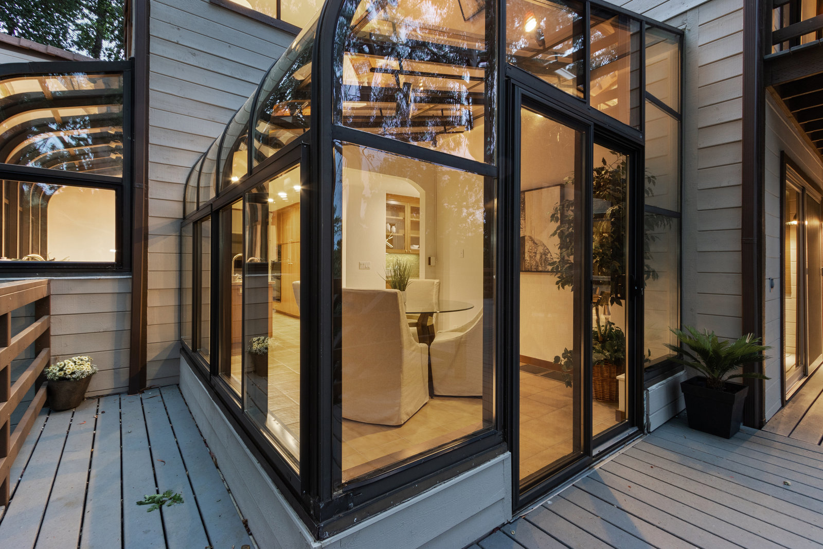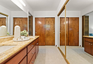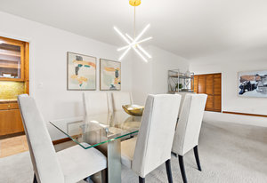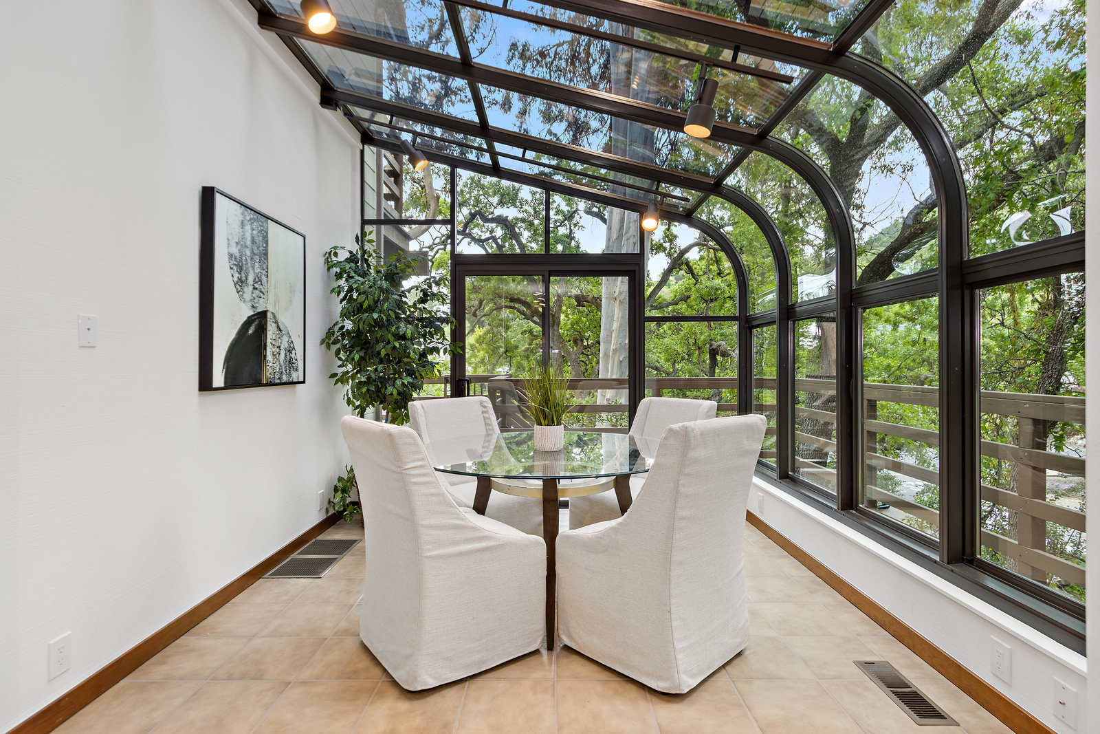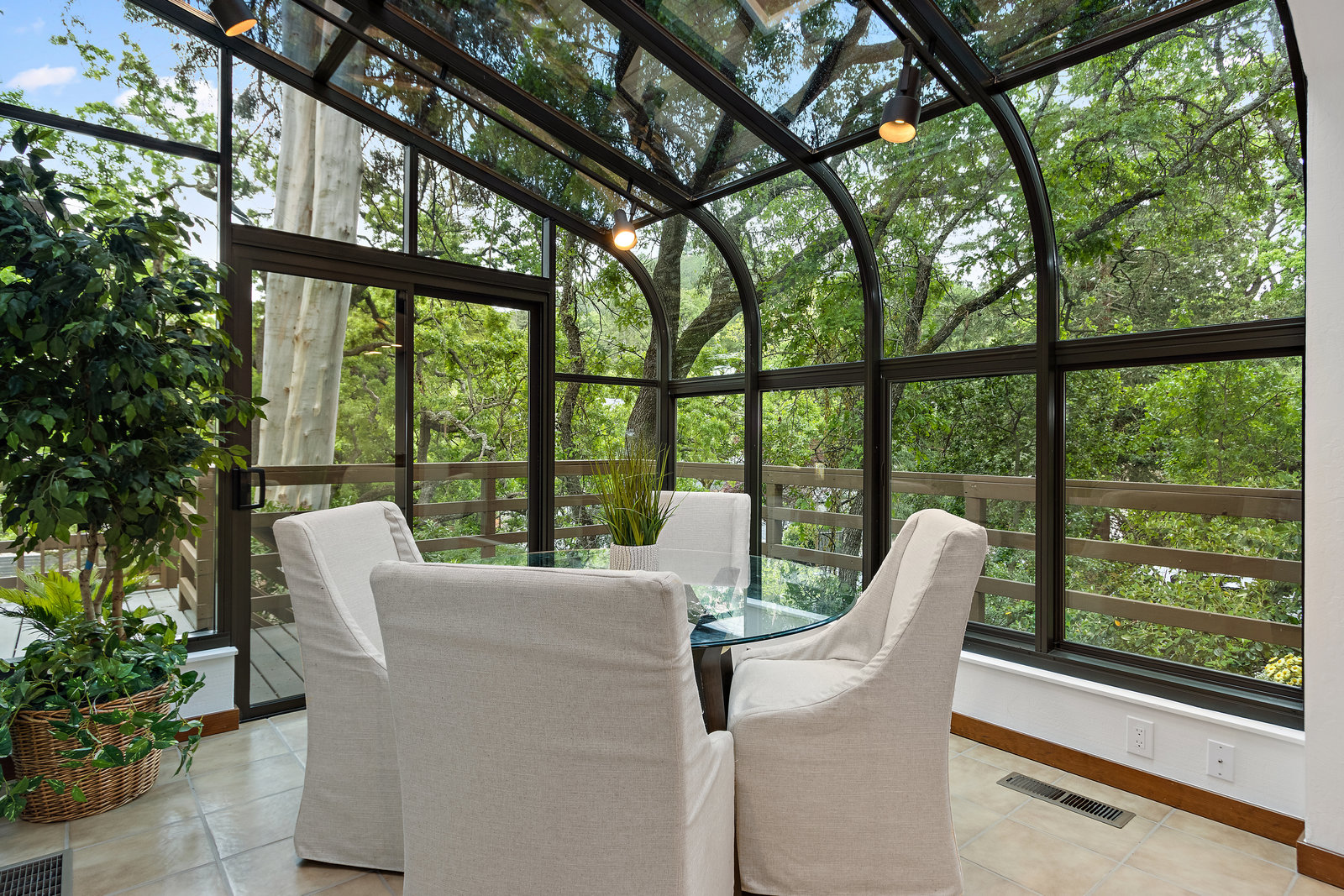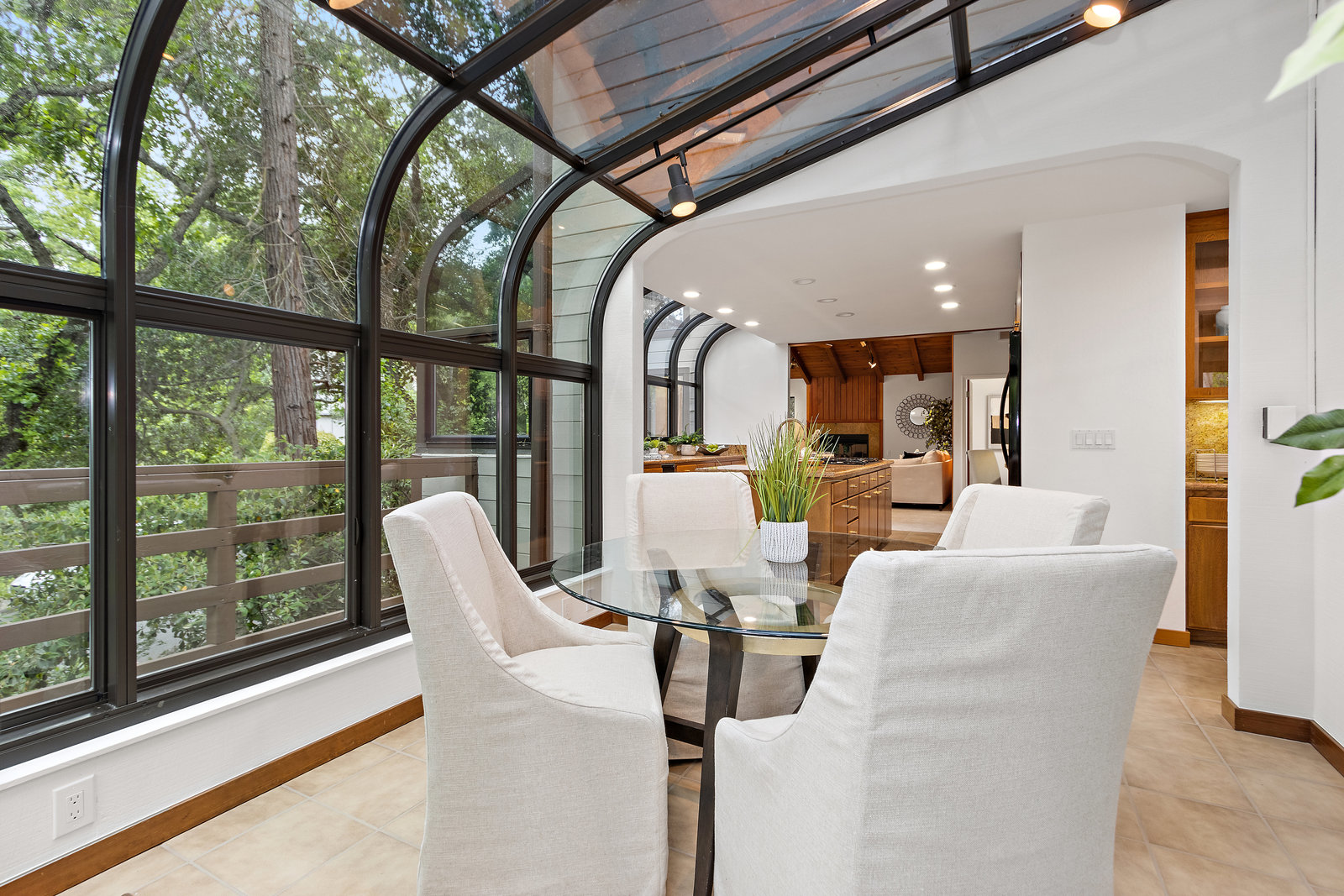 The beautiful chef’s kitchen features a serving/display/storage buffet with glass front cabinets. Atrium dining area with a slider to the outside creates a unique casual dining experience. Also features an atrium window the length of one wall for a perpetual sunny daytime experience and dramatic night time views. Amenities: double sink, dishwasher, trash compactor, and an oversized island with a five burner gas range and prep sink, as well as a refrigerator, microwave, double ovens in the wall, tile floor, granite countertops, and a planning/work desk with plentiful organization aids.