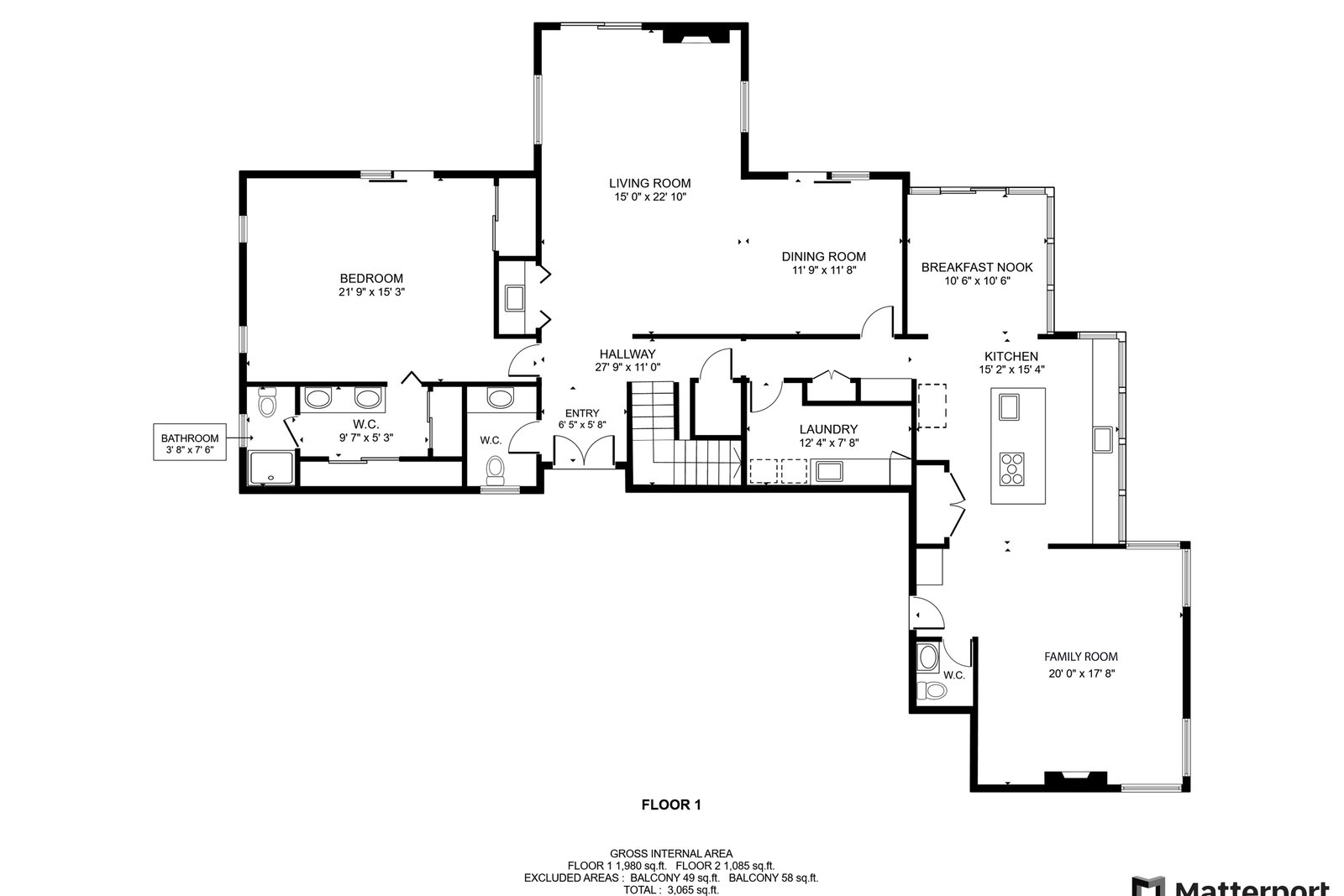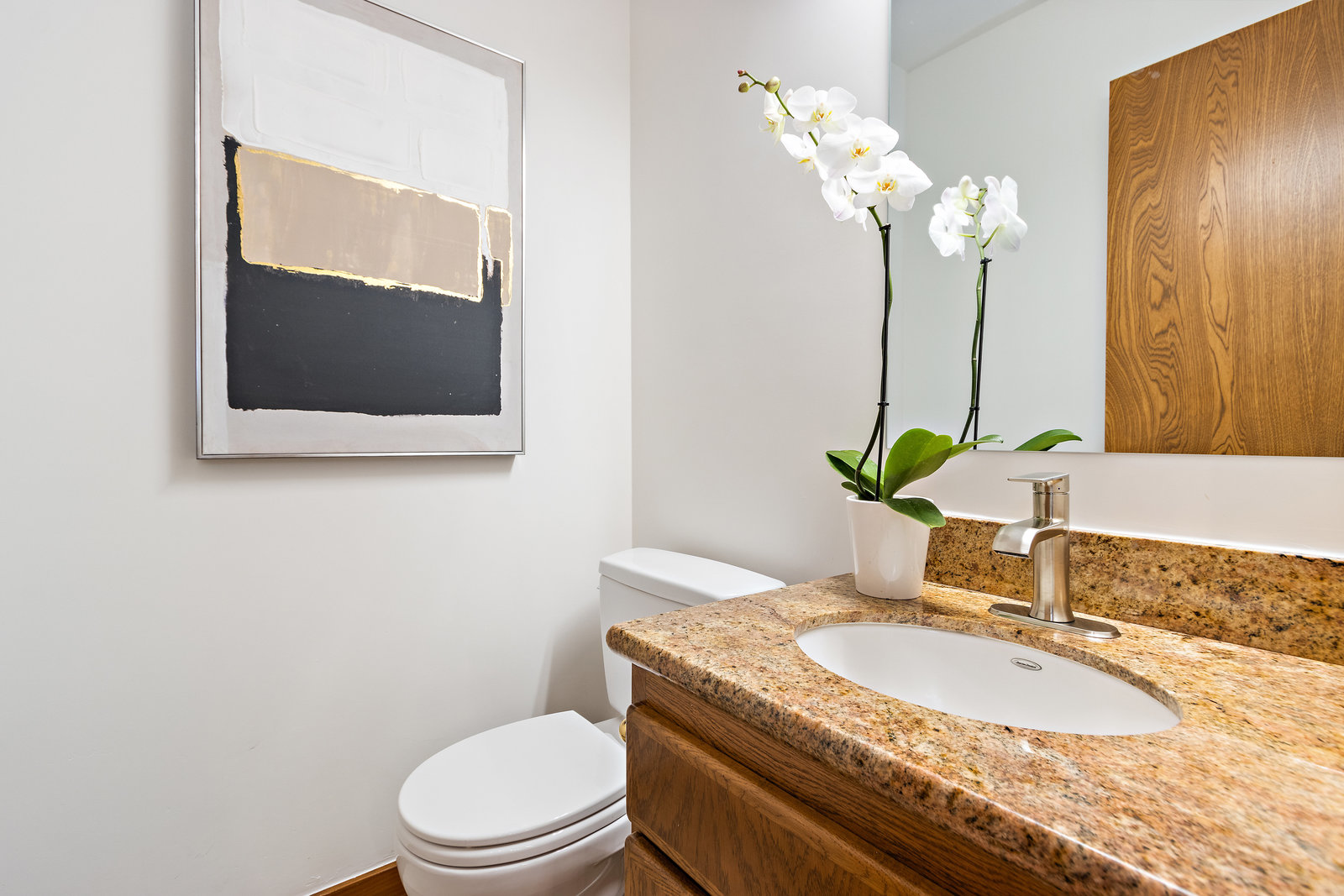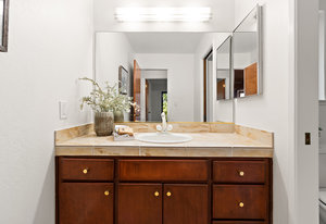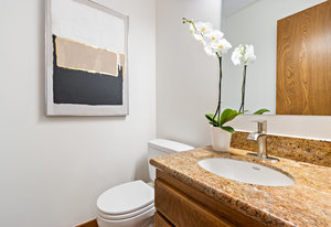 Second half bath off the kitchen/family room with a single sink vanity.