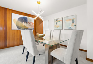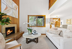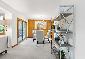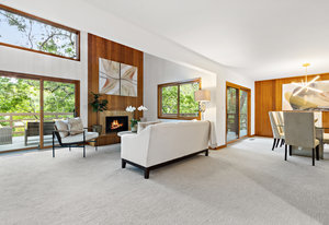 The great room has vaulted wood ceilings and picture windows that allow ample light into the space, and a sliding door to the deck where you can enjoy views of the mature vegetation. The dining room has wood paneling and a slider to the deck. The wet bar with sink, shelving, and cabinets, as well as the 2 story wood framed fireplace with raised hearth and marble surround, gas starter, are both lovely features.