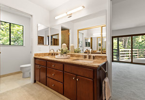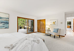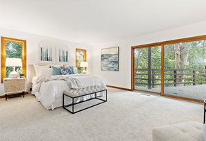 The primary bedroom suite is located on the main level and has a slider to the deck. The luxurious bathroom boasts double sinks, granite countertops, multiple closets, and a walk-in shower.