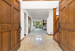Stunning double door entry. As you step inside, you'll notice the powder room off the entry featuring a beautiful marble tile countertop, tile floor, and window. Adjacent guest closet.