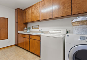 There is also storage under the stairs plus a laundry room with a sink and storage cabinets, with the washer and dryer remaining with the property, and a built-in ironing board.