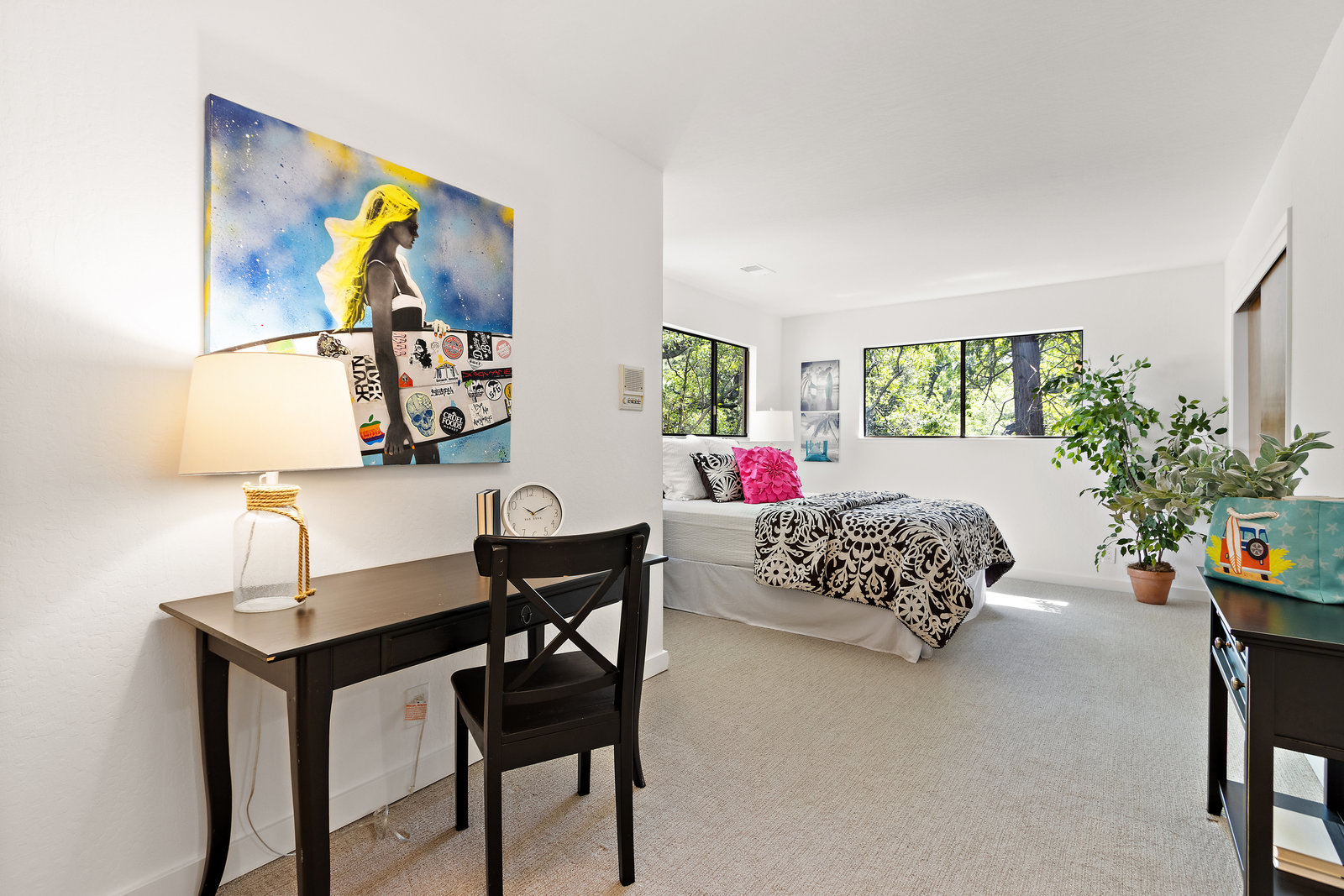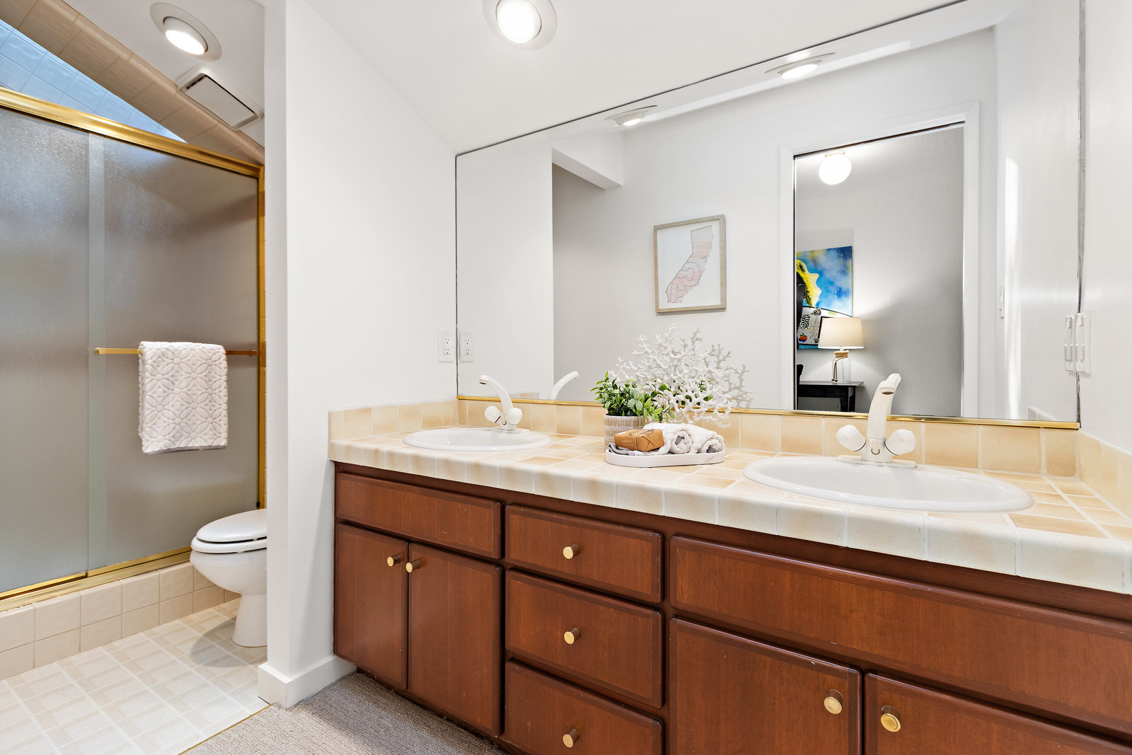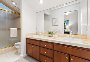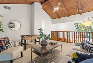Upstairs, there is a spacious loft bonus space overlooking downstairs, hall bathroom with tile shower over the tub with a glass enclosure, plus two bedrooms with private decks. The fourth bedroom is ensuite with its own bath featuring double sinks and a walk-in shower. Additional hall storage closet with organizers.