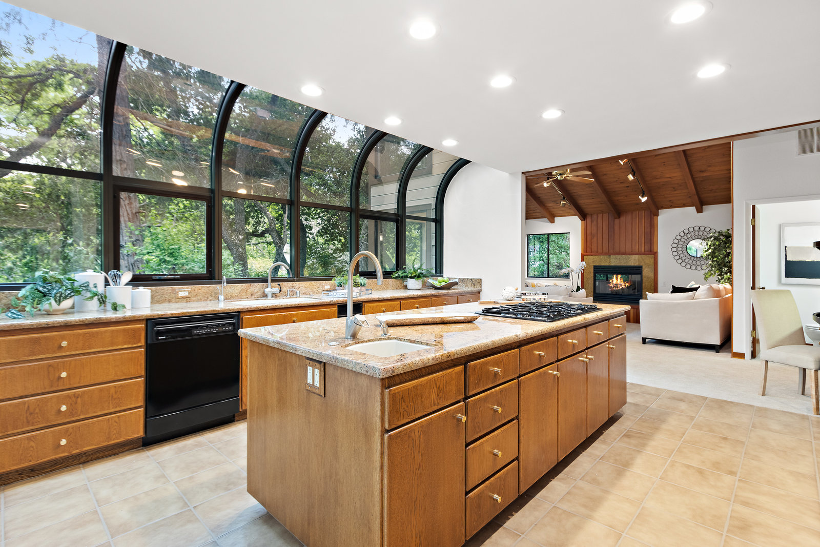 The kitchen opens to the family room featuring wood beamed vaulted ceilings, ceiling fan, fireplace with raised hearth seating area, and striking wood accents throughout.