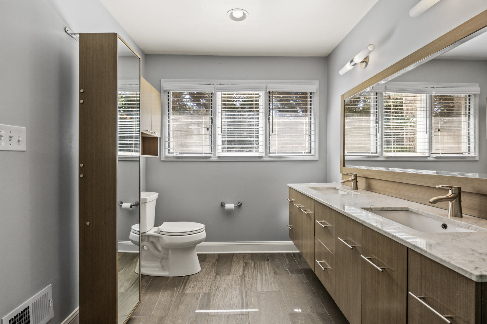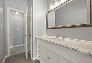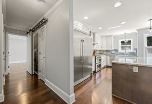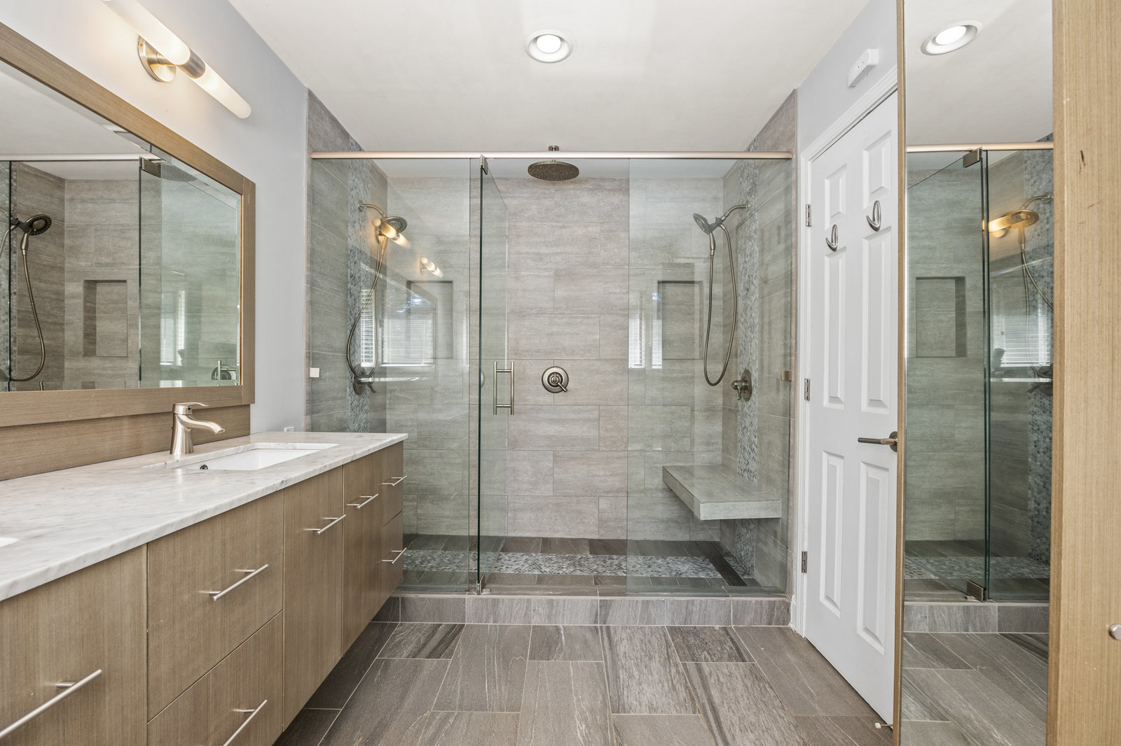On the main level, the oversized master suite is a true retreat, complete with his and hers closets and an incredible bath featuring a 3-head shower with a floating bench. A beautiful powder room and convenient laundry closet are also located on the main level.
