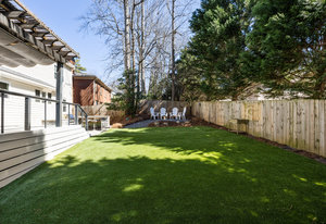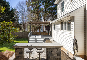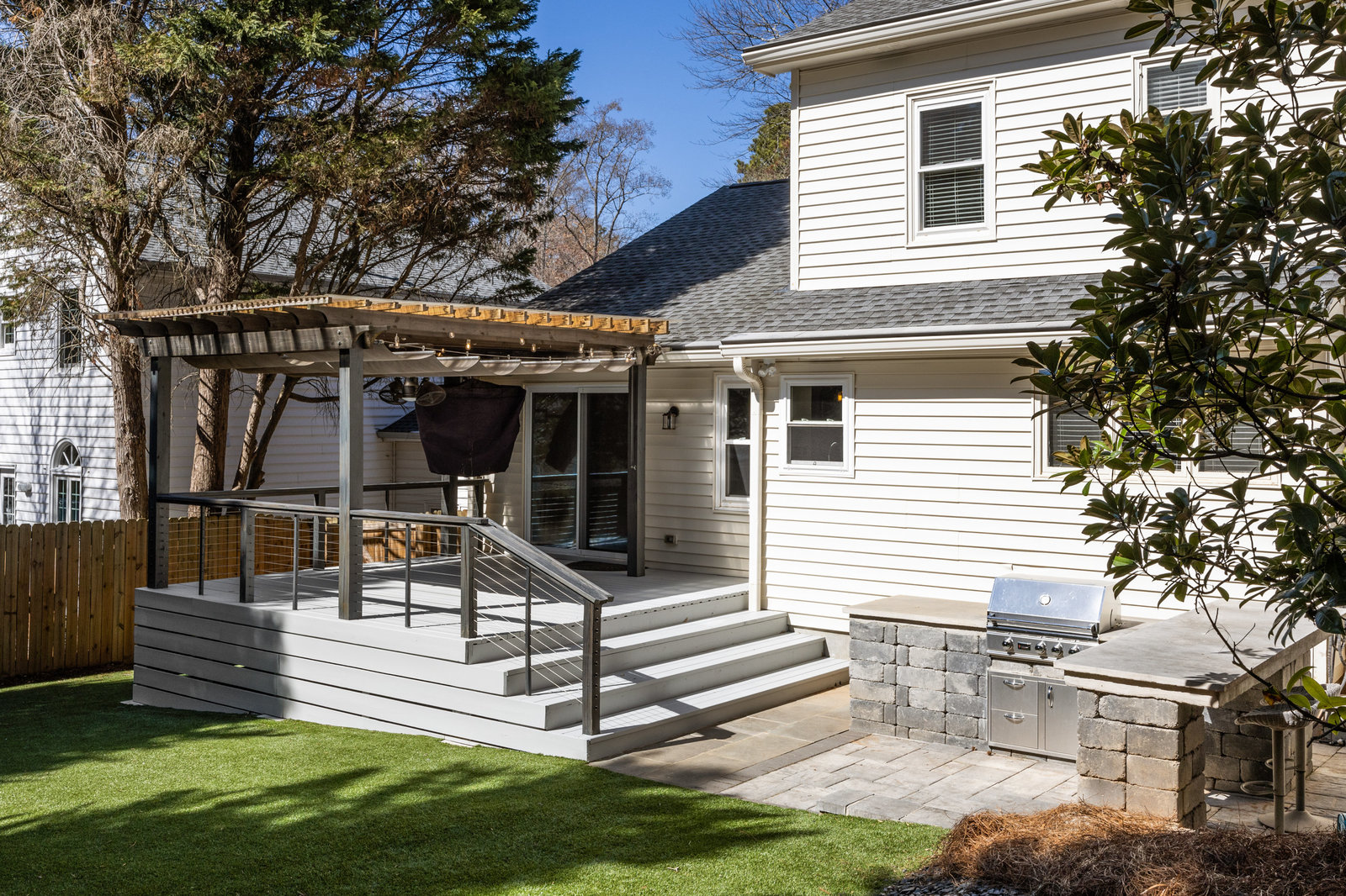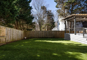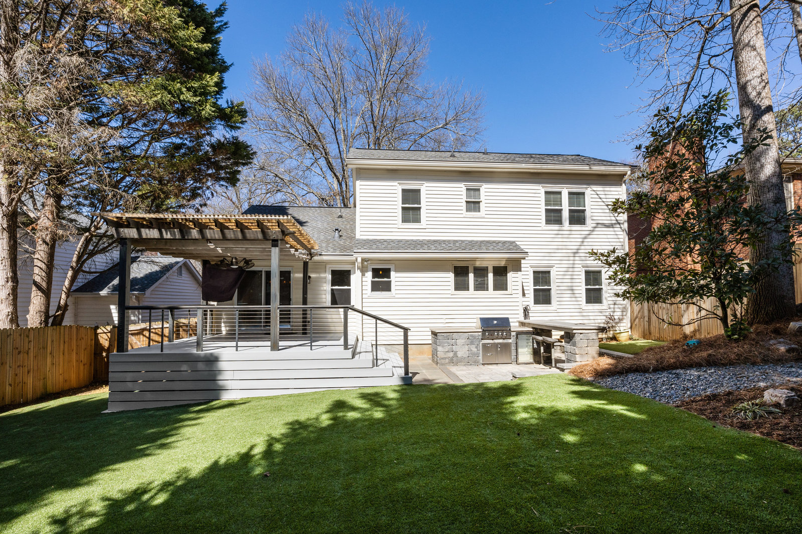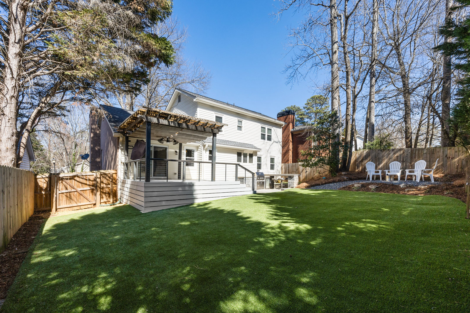 Step outside to your own private oasis! The large ground-level deck with a covered pergola creates a perfect space for relaxation and entertaining. Enjoy the built-in outdoor bar with a grill and low-maintenance turf grounds, offering year-round enjoyment.