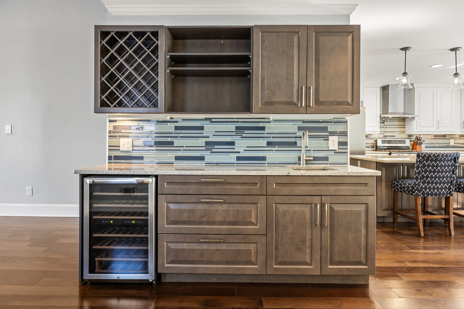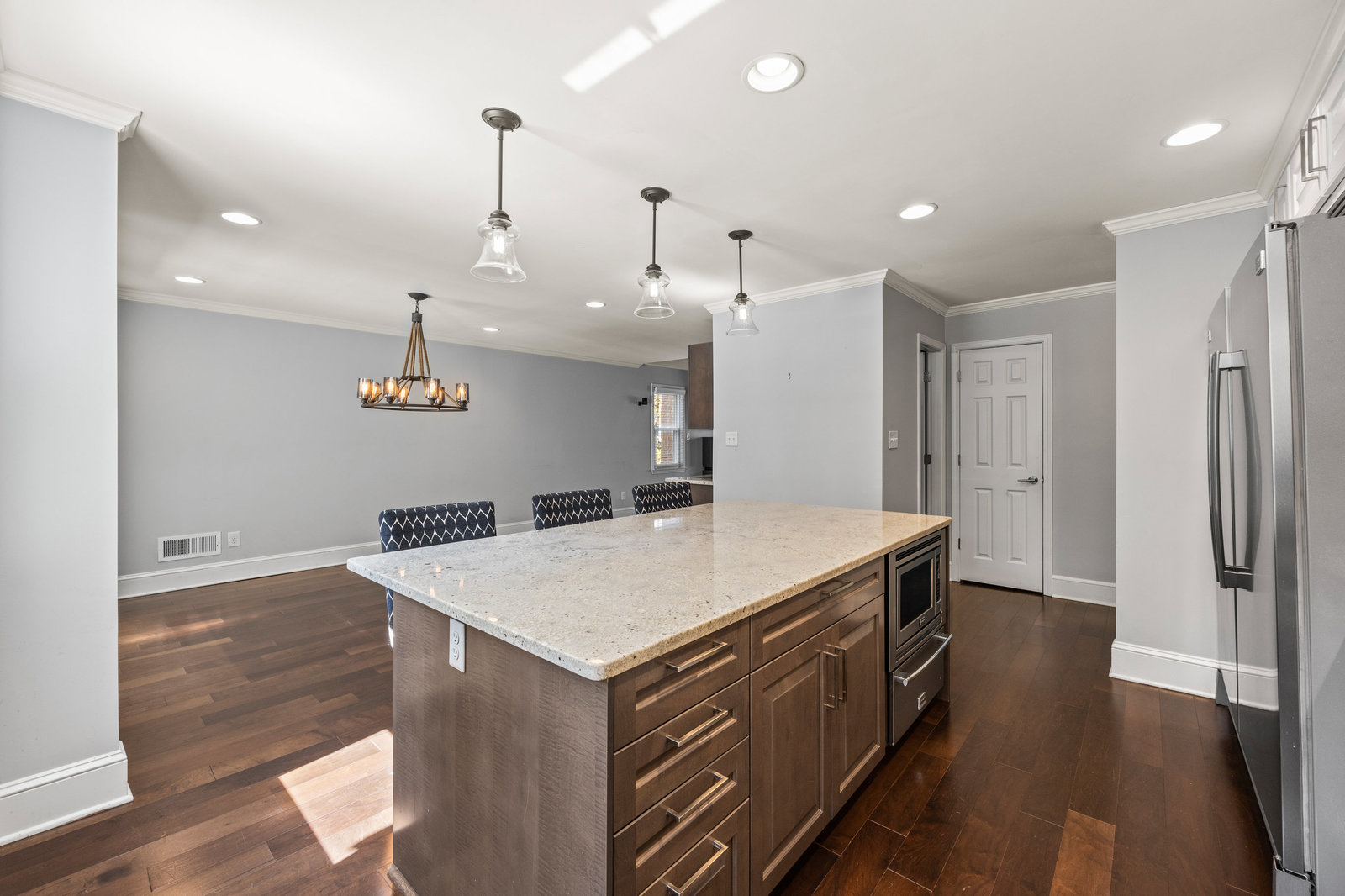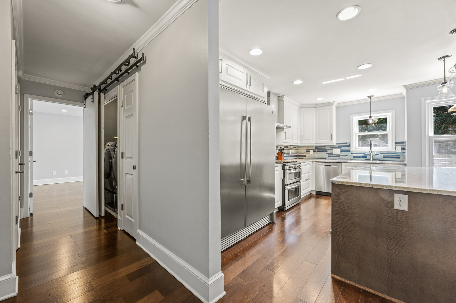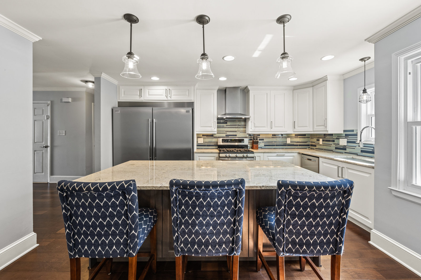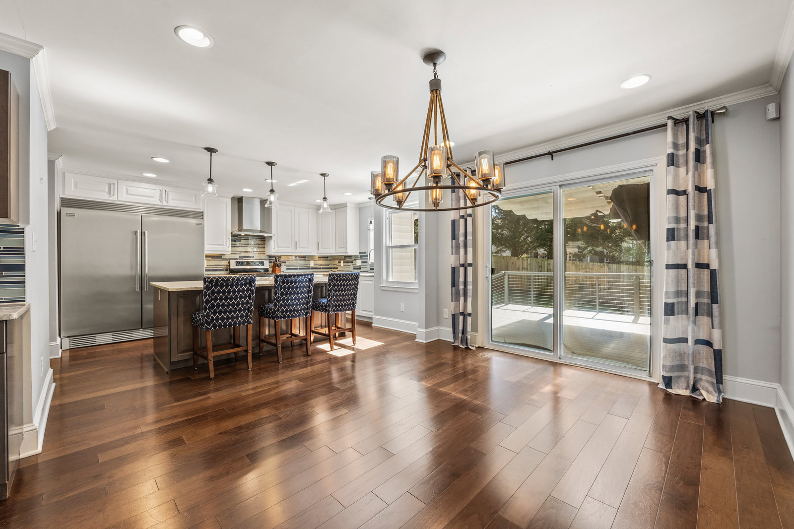 The dream kitchen is a chef’s delight, boasting a spacious layout with an oversized refrigerator, top-of-the-line stainless steel appliances—including a double oven, microwave, warming drawer—and stunning stone countertops providing plenty of work space.