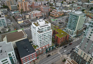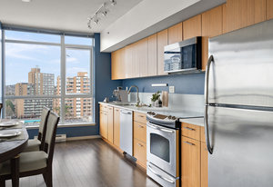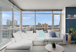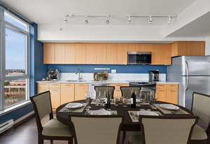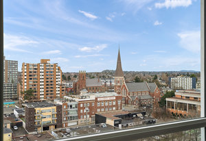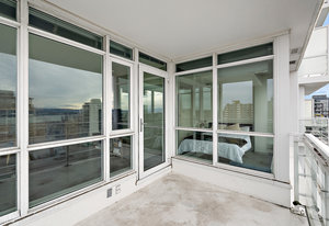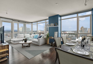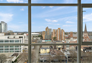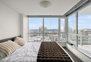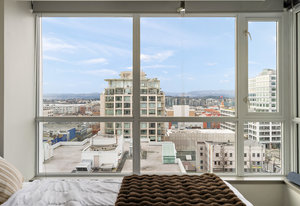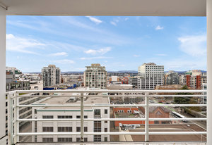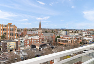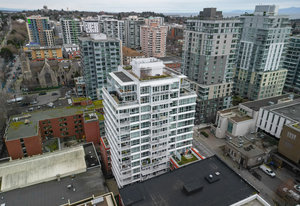 Prepare to be captivated by the panoramic ocean views from this exquisite 12th-floor corner condo at #1206-834 Johnson Street. This spacious 1-bedroom residence, located in the highly sought-after "834" steel and concrete building by Chard Properties, offers a luxurious urban lifestyle. Step inside to discover floor-to-ceiling windows that flood every room with natural light, highlighting the high ceilings and elegant engineered hardwood floors. The modern kitchen features sleek quartz countertops and Frigidaire Gallery appliances. Enjoy the generous living space and the expansive covered deck, perfect for entertaining or relaxing while taking in the stunning West and North views. ...