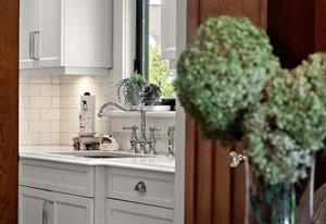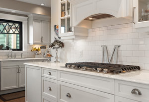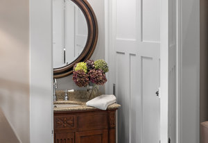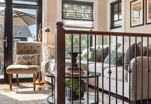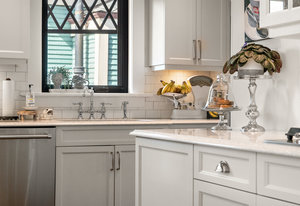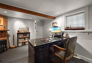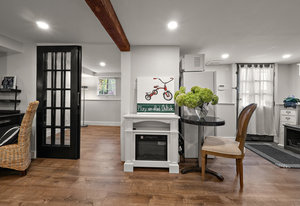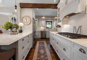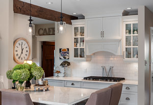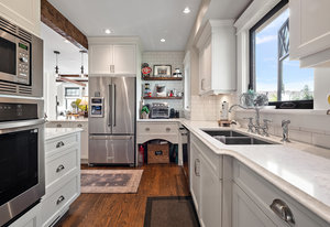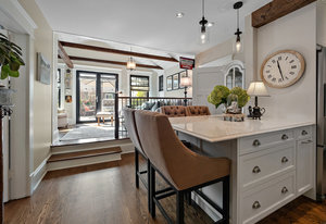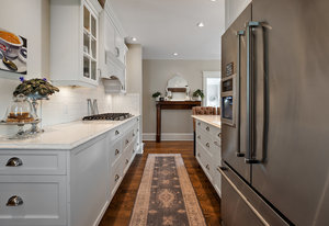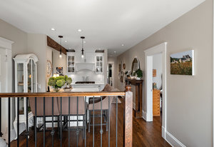 A formal living room features classic built-ins, a fireplace & sun-lit bay windows. The bright custom eat-in kitchen boasts quartz counters, pot drawers, gas cooktop, with custom hood surround, double wall oven & a dining island.