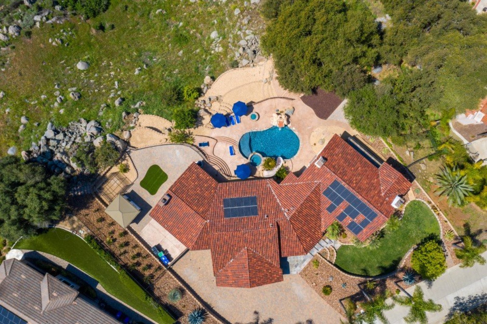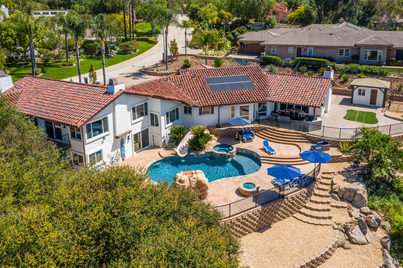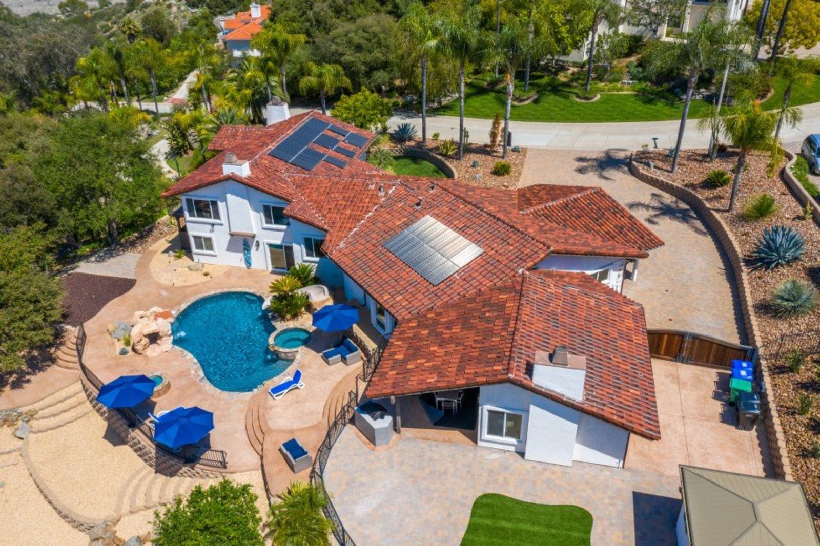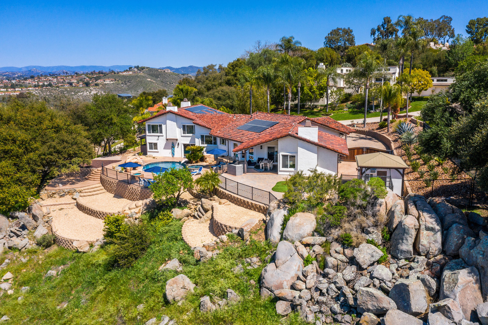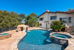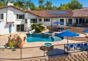Welcome to this turnkey, mint, great feeling, custom beauty sited on a peaceful 1.16 acre lot in the highly coveted neighborhood of The Trails in Rancho Bernardo. Paver lined driveway, sleek garage, and a glass pivot front door. The floor plan allows all kinds of possibilities (including multi-generational living). Recently remodeled kitchen and bathrooms, newer HVAC system and ducting, owned solar, spectacular views, 3 car garage with epoxy flooring, newer flooring, custom closets, pool with slide, spa, outdoor surfboard shower and much more. No Mello-Roos and located in the highly acclaimed Poway Unified School District.