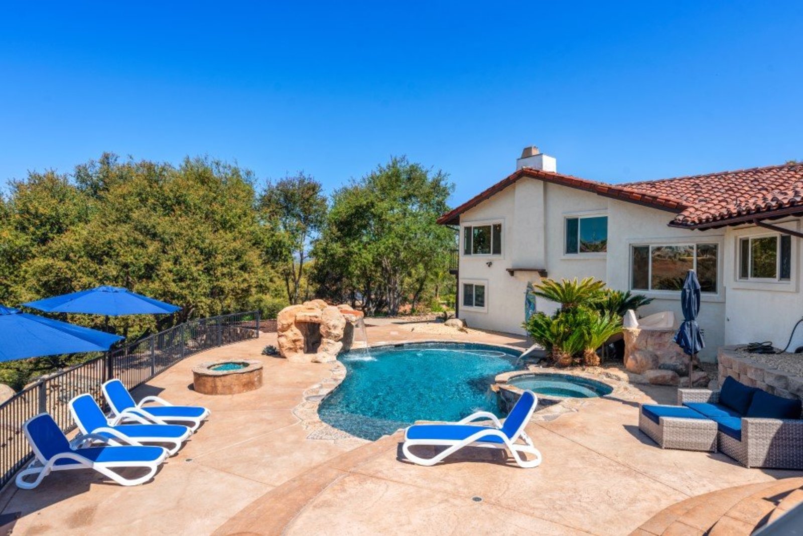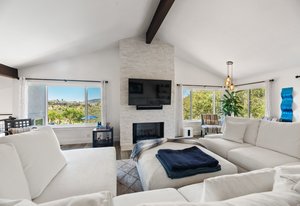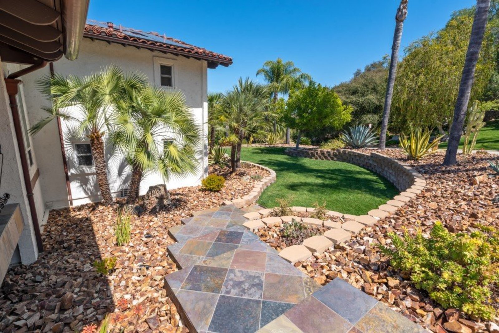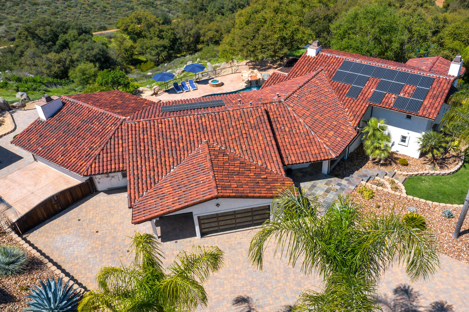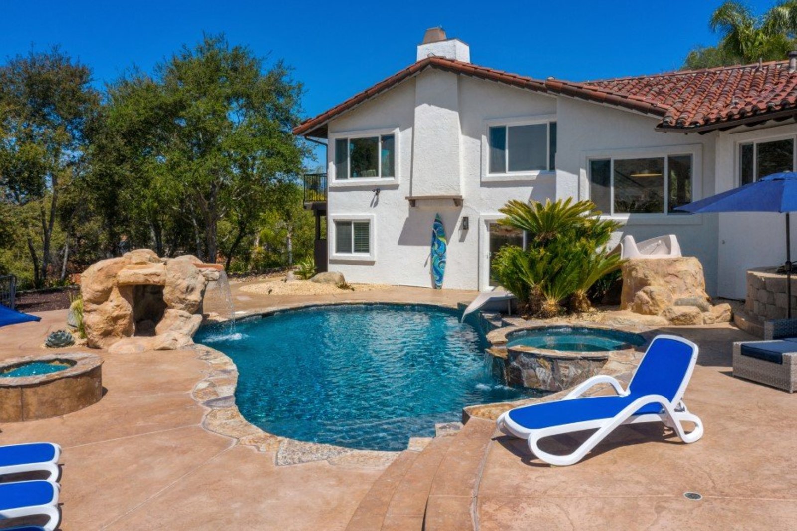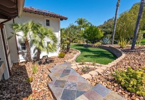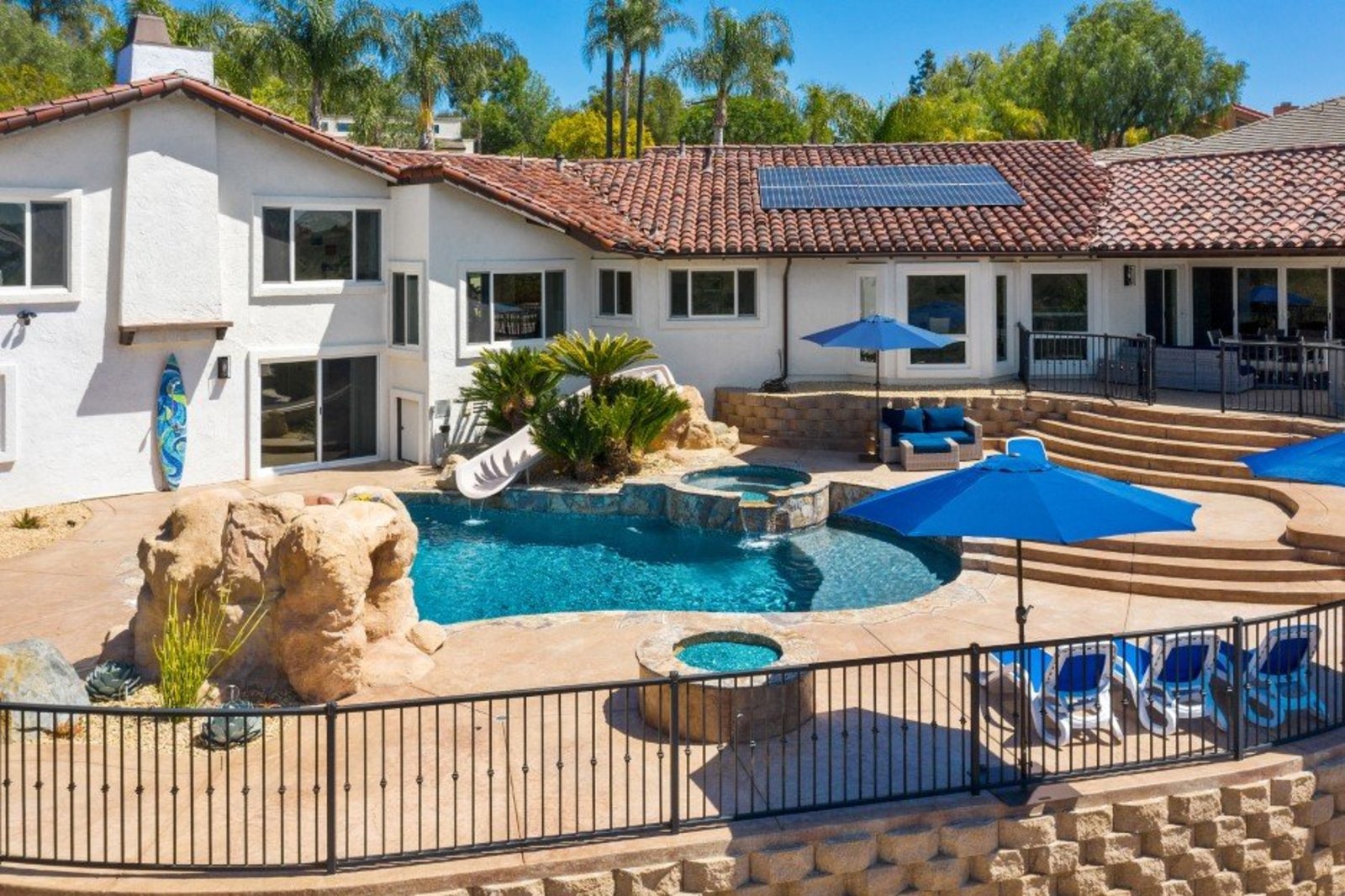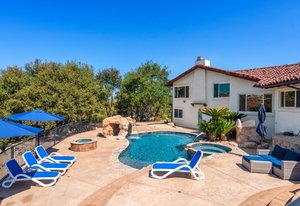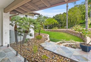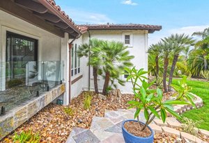 Pack your bags and get ready to move into this feel-good property which is tucked away in the coveted neighborhood of The Trails in Rancho Bernardo. Curbside appeal will have you wanting more even from the look of the highly attractive, numbered mail box and the front yard is meticulously maintained, yet relatively low maintenance. Highlights include a paver lined spacious driveway that accommodates plenty of guest parking, low voltage lighting on sensors to highlight the beautiful palm trees, a sleek looking see through garage and a security system with cameras to give you added piece of mind. Upon walking past the tranquil water feature and glass railing, you will enter through the glass "Pivot Door", which allows an abundance of natural light inside. As if you couldn’t already tell that the owner has put a lot of love and attention to detail into this home, even all the outlets throughout are super clean and streamlined, having zero screws visible. The main level features a powder room, bedroom, gorgeous remodeled kitchen with pantry, separate bar area, breakfast nook, family room/bonus room that is 23X18 (currently being used as a bedroom-ideal for extended family or can be a game room/workout area, large office-the possibilities are endless-a remodeled, full bathroom is within this area) This family room is NOT one of the official 5 bedrooms. Down a few stairs from the main level are three good sized bedrooms, an updated full bathroom with dual vanities, the laundry room, and a 24x14 common area. Up a few stairs from the main level, you will find a 27x18 living/family room, that has a spacious deck off of it. Near this area is the primary bedroom, which is generously sized and has an area in the corner which provides a host of options (massage table, workout equipment, office, nursery, sitting/reading/watching TV area). The primary bathroom has been remodeled in 2023 and just has a great feel to it, including a “secret” door to the walk-in closet. The 3-car garage is about as clean of a garage as you can possibly fathom with epoxy flooring, newer Lift Master components/motors. Out back, come enjoy the good life with canyon views, spectacular sunsets, all while using the BBQ, eating outside, or going down the slide into the refreshing pool (of course, this is after rinsing off under the outdoor shower that has a surfboard), or soaking it all in the spa. There is a shed/indoor/outdoor dog kennel in the backyard as well for those of you wanting to give your pooch a place to roam inside or out. The number of amenities/upgrades/features are simply too many to list and the only way to appreciate it all is to see it in person, but here are some to consider: owned solar for the home, Tesla charger with installed electric, 2 Tesla wall batteries, whole house fan, upgraded irrigation system (has rain sensors), smart home capabilities (ie, Google Hubs), pool automation, security system with cameras and sensor lights, newer flooring, neutral/tasteful paint colors, newer HVAC system including ducting. No Mello-Roos and located in the highly acclaimed Poway Unified School District. The Trails of Rancho Bernardo is a highly sought-after neighborhood in the 92128 zip code and consists of approximately 259 custom homes, all on minimum 1 acre lots. Come make this turnkey, meticulously maintained property your next home!