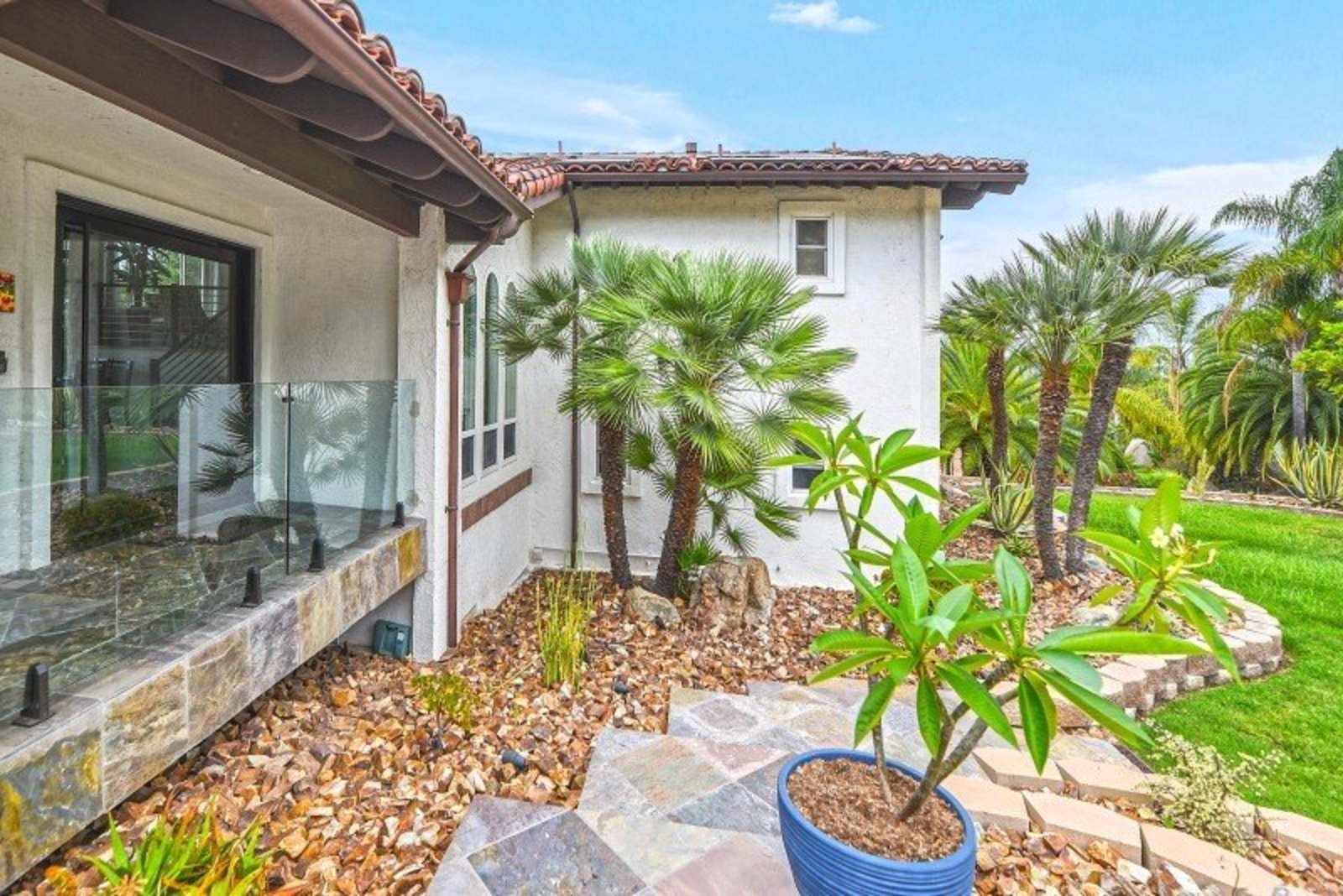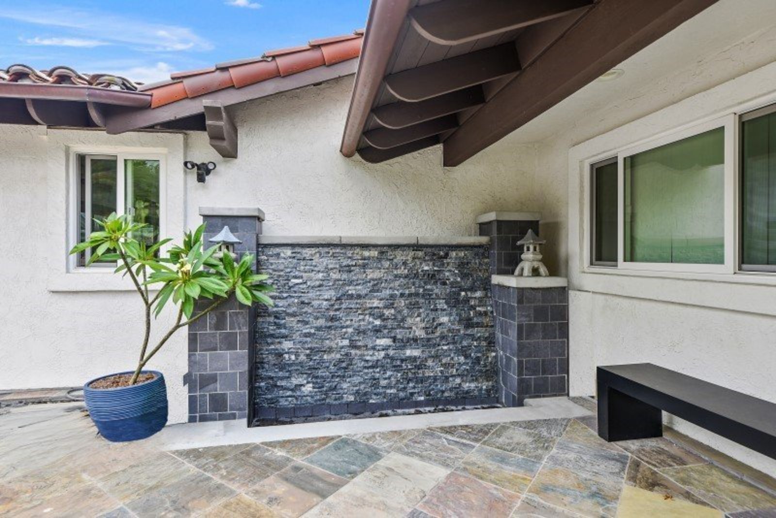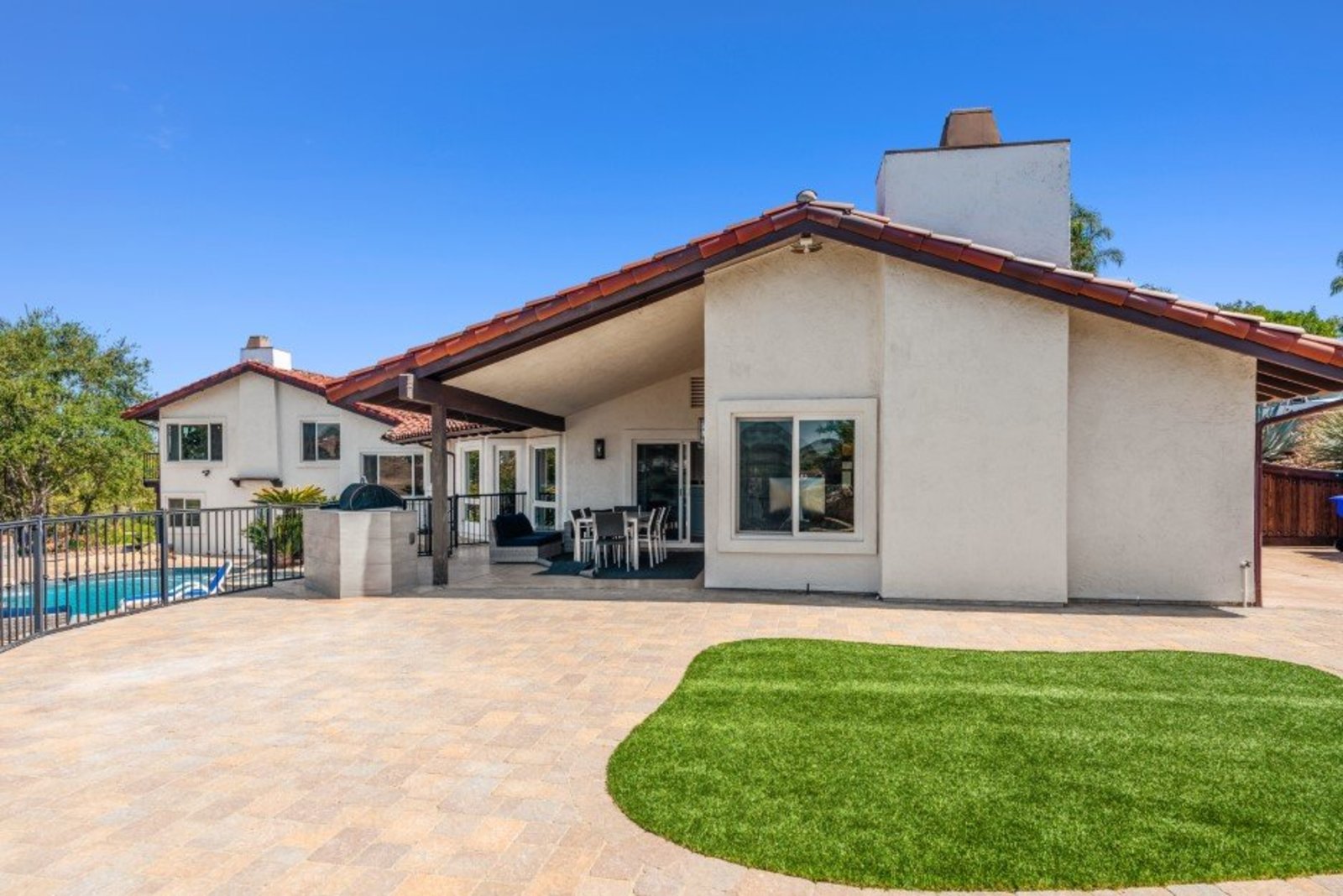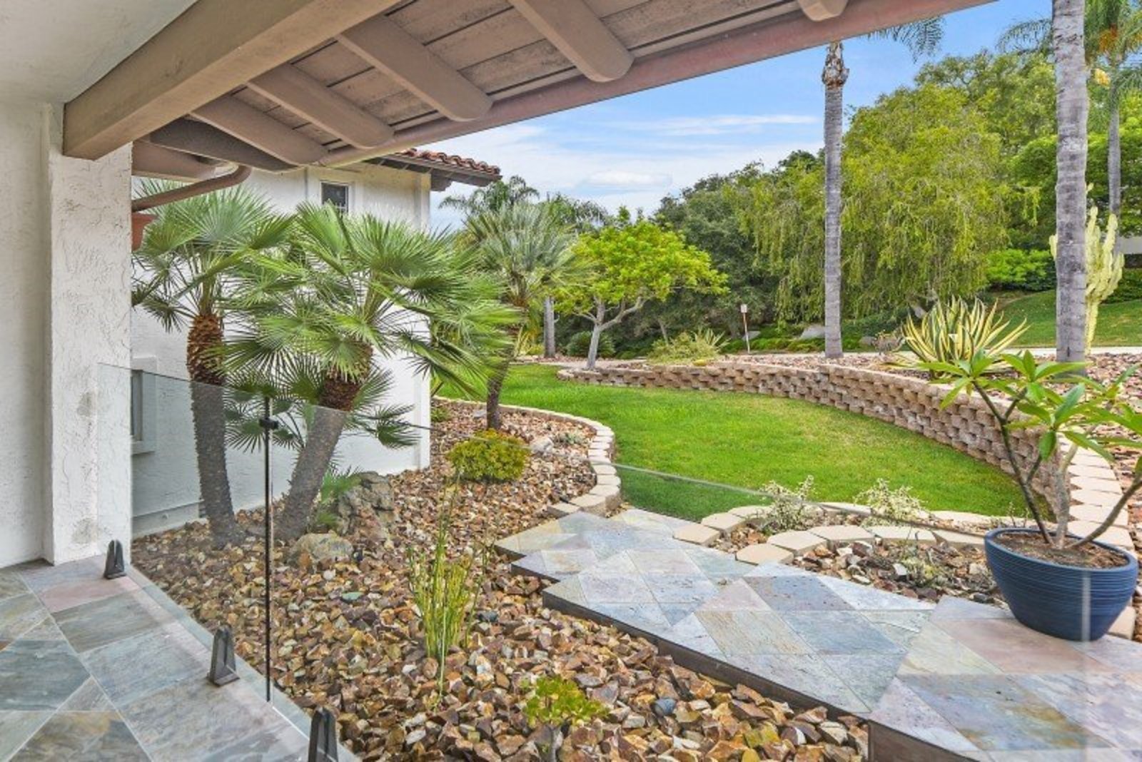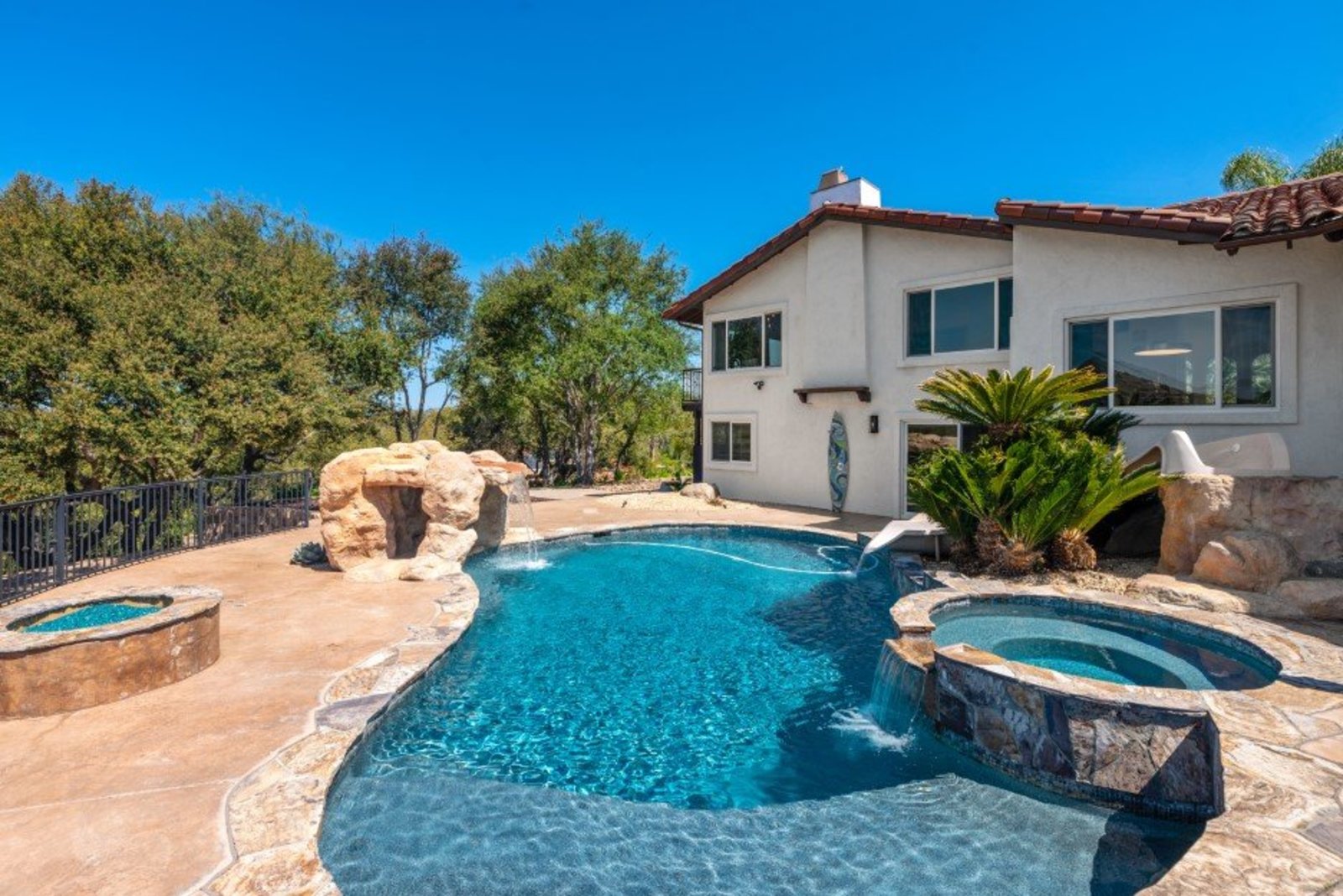 Pack your bags and get ready to move into this feel-good property which is tucked away in the coveted neighborhood of The Trails in Rancho Bernardo. Curbside appeal will have you wanting more even from the look of the highly attractive, numbered mail box and the front yard is meticulously maintained, yet relatively low maintenance. Highlights include a paver lined spacious driveway that accommodates plenty of guest parking, low voltage lighting on sensors to highlight the beautiful palm trees, a sleek looking see through garage and a security system with cameras to give you added piece of mind. Upon walking past the tranquil water feature and glass railing, you will enter through the glass "Pivot Door", which allows an abundance of natural light inside. As if you couldn’t already tell that the owner has put a lot of love and attention to detail into this home, even all the outlets throughout are super clean and streamlined, having zero screws visible. The main level features a powder room, bedroom, gorgeous remodeled kitchen with pantry, separate bar area, breakfast nook, family room/bonus room that is 23X18 (currently being used as a bedroom-ideal for extended family or can be a game room/workout area, large office-the possibilities are endless-a remodeled, full bathroom is within this area) This family room is NOT one of the official 5 bedrooms. Down a few stairs from the main level are three good sized bedrooms, an updated full bathroom with dual vanities, the laundry room, and a 24x14 common area. Up a few stairs from the main level, you will find a 27x18 living/family room, that has a spacious deck off of it. Near this area is the primary bedroom, which is generously sized and has an area in the corner which provides a host of options (massage table, workout equipment, office, nursery, sitting/reading/watching TV area). The primary bathroom has been remodeled in 2023 and just has a great feel to it, including a “secret” door to the walk-in closet. The 3-car garage is about as clean of a garage as you can possibly fathom with epoxy flooring, newer Lift Master components/motors. Out back, come enjoy the good life with canyon views, spectacular sunsets, all while using the BBQ, eating outside, or going down the slide into the refreshing pool (of course, this is after rinsing off under the outdoor shower that has a surfboard), or soaking it all in the spa. There is a shed/indoor/outdoor dog kennel in the backyard as well for those of you wanting to give your pooch a place to roam inside or out. The number of amenities/upgrades/features are simply too many to list and the only way to appreciate it all is to see it in person, but here are some to consider: owned solar for the home, Tesla charger with installed electric, 2 Tesla wall batteries, whole house fan, upgraded irrigation system (has rain sensors), smart home capabilities (ie, Google Hubs), pool automation, security system with cameras and sensor lights, newer flooring, neutral/tasteful paint colors, newer HVAC system including ducting. No Mello-Roos and located in the highly acclaimed Poway Unified School District. The Trails of Rancho Bernardo is a highly sought-after neighborhood in the 92128 zip code and consists of approximately 259 custom homes, all on minimum 1 acre lots. Come make this turnkey, meticulously maintained property your next home!