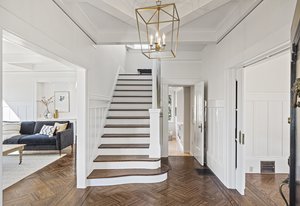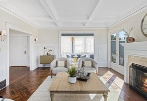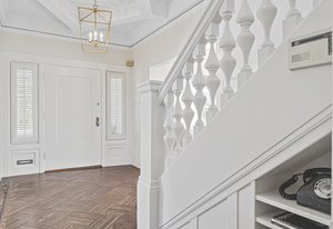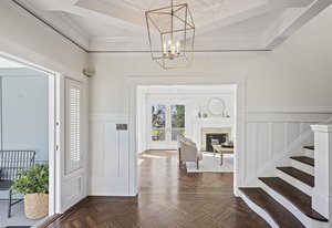 Grand foyer with incredible diamond boxed ceiling and parquet wood floors