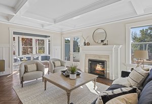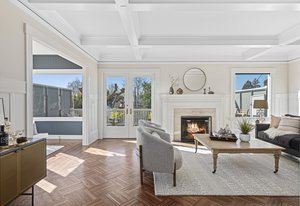 Grand scale living room offers exquisite mill work, wood burning fireplace, large picture windows and French doors open to sprawling sunlit terrace