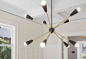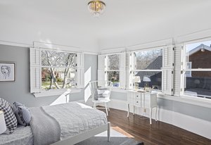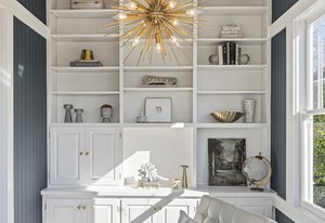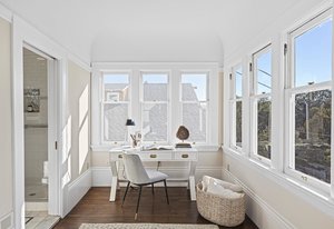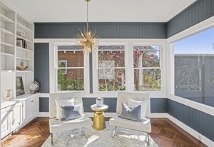A fab study off living room features large windows and beautiful built-in bookshelves