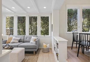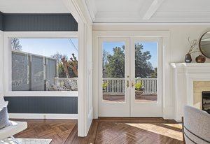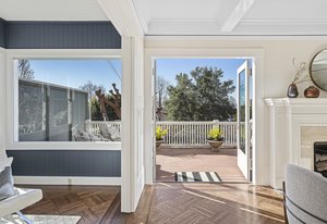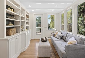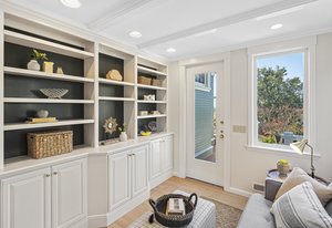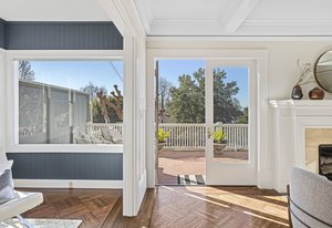 Adjoining family room with built-in media cabinetry and easy access to deck and gardens