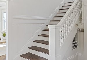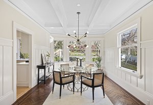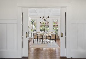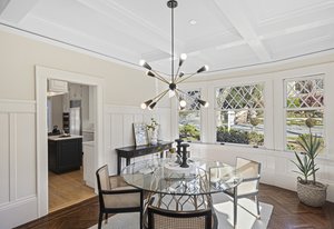 Beautifully Formal Dining Room with glass paneled pocket doors, wainscoting and diamond paned Bay window
