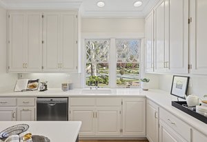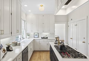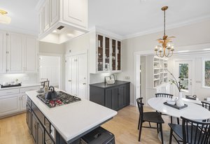 Chef’s eat-in kitchen with white cabinetry, veined quartz backsplash & countertops, Franke Farmhouse sink, large Island and high-end stainless appliances.