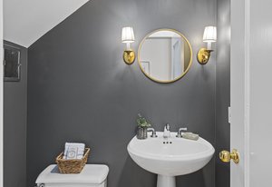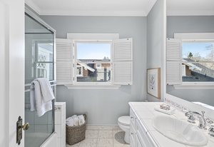 Hall bath is ideal for sharing with its high ceilings, whimsical tile, shower-tub combo and vanity with double sinks.
