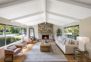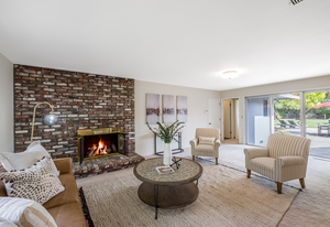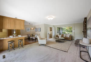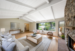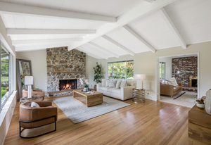 Open the double door entry to the sunlit interior! The formal living room has a vaulted, exposed beam ceiling and stone fireplace. The adjacent formal dining room with additional fireplace overlooks the generous front landscape.