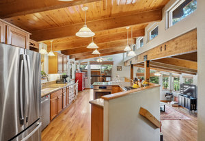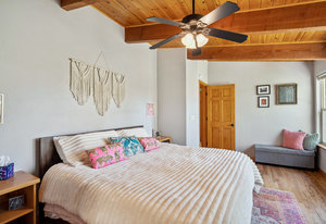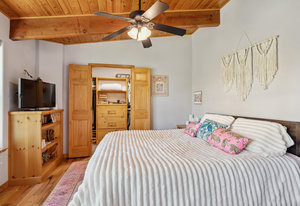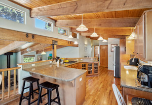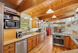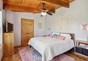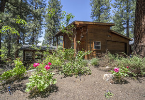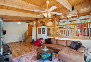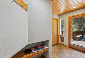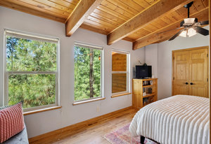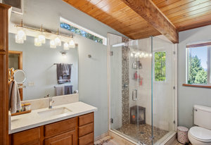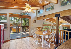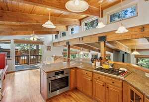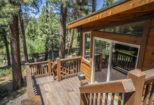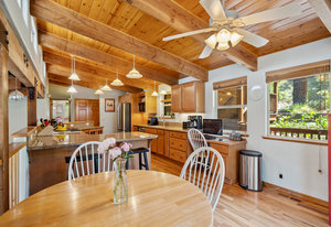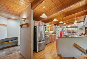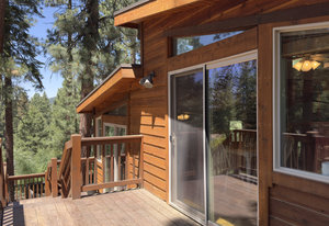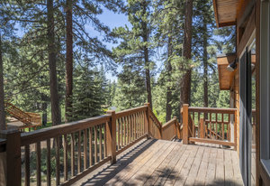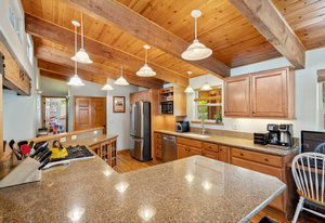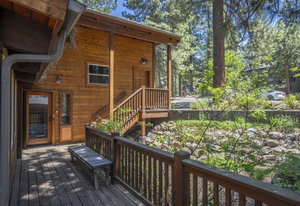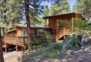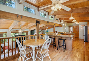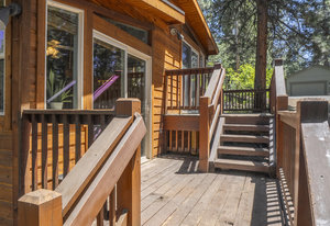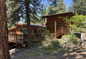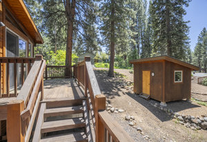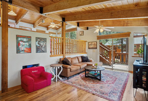 Situated on a third of an acre within the sought-after Glenshire neighborhood, this inviting mountain home offers privacy, space, and character. A fully fenced and terraced yard, paired with wraparound decking, creates a peaceful outdoor retreat—perfect for relaxing or entertaining. Inside, you’ll find vaulted wood-beamed ceilings, hardwood flooring, and thoughtful updates throughout. The living room features a cozy gas stove with a stone tile hearth, abundant windows that invite in natural light, and direct access to the deck. Perched just above the living area, the spacious kitchen includes granite countertops, stainless steel appliances, a Wolf gas cooktop, and an easy flow into the dining area—with a second access point to the side decking. The main bedroom boasts a generous walk-in closet with custom built-ins, while the second bedroom features its own loft with ladder access—perfect as a creative nook or play space. A beautifully updated and tiled bathroom with a large walk-in shower, a stone tile entry, and a generous laundry closet complete the interior. The spacious two-car garage provides convenient, direct access into the home, and a large storage shed offers plenty of room for all your mountain gear. Whether you're seeking a full-time residence or the perfect weekend escape, this Glenshire gem is one you’ll surely want to see!