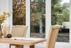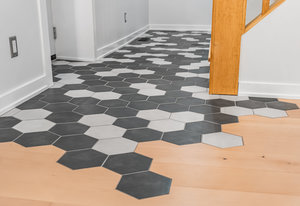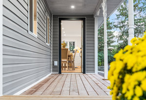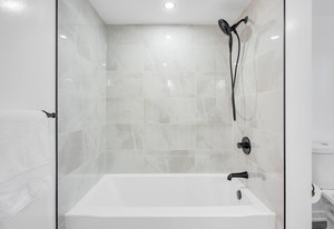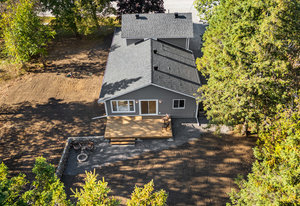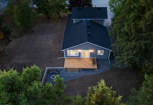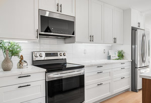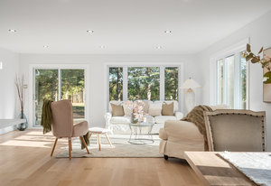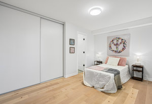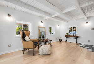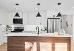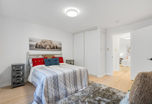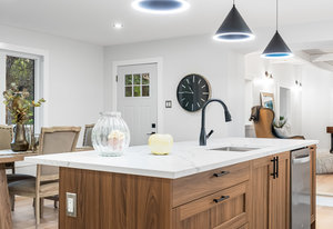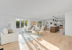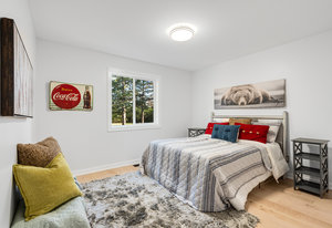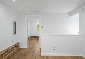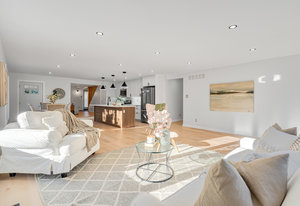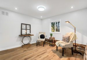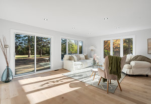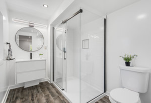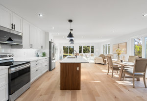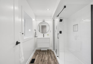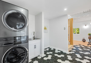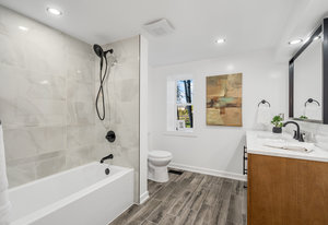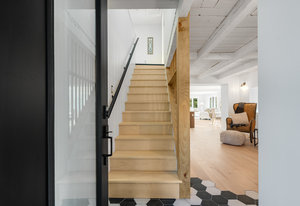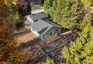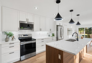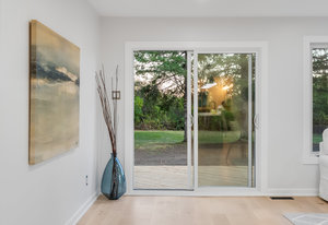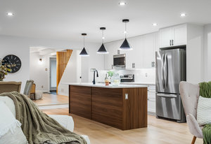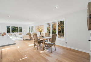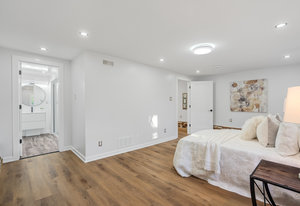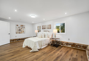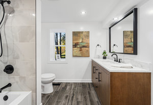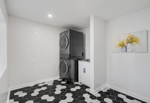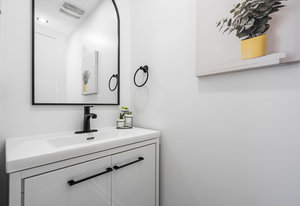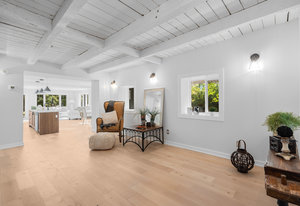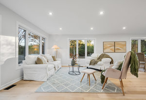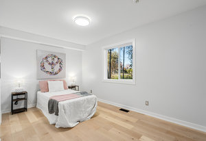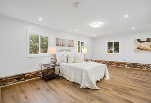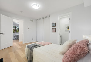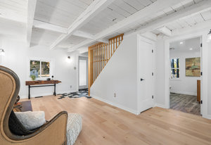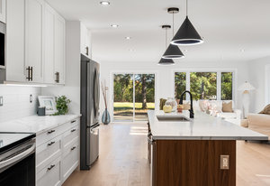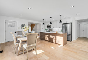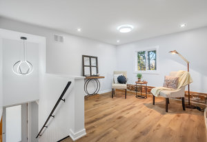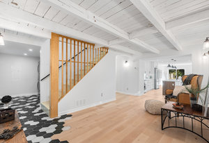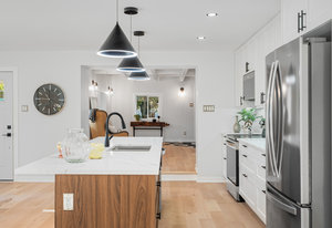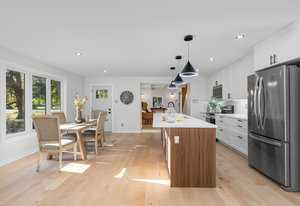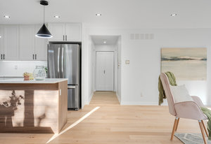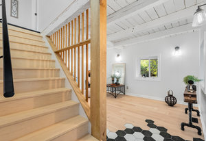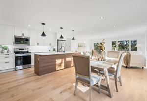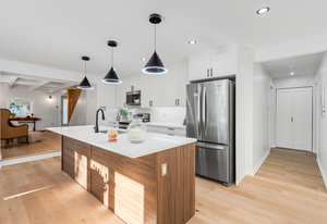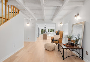 Inside, nearly 2,000 sq ft of living space has been thoughtfully renovated. The main floor greets you with a stylish geometric-tiled foyer and elegant hardwood staircase. Wide plank engineered hardwood flows through the open-concept living, dining, and kitchen area. The kitchen is designed for gathering, with a large island offering seating and abundant natural light flooding the main space through oversized windows and sliding doors. Two bedrooms are located on this level, including one with its own powder room, alongside a full bath and spacious laundry room.