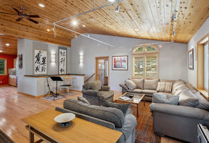 Welcome to this beautifully updated Glenshire home, where comfort, design, and functionality come together seamlessly. Step through the airlock entry into an open-concept living space featuring vaulted wood ceilings, rich maple hardwood floors, a cozy gas stove with stone hearth, and expansive windows that make you feel like you're nestled in the trees.