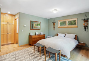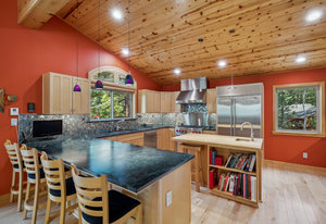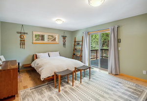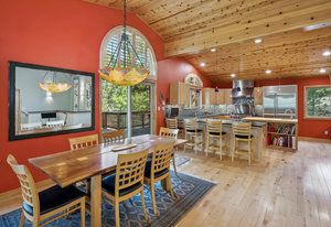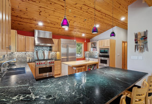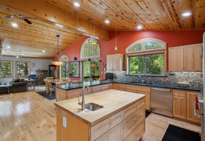 The living area flows effortlessly into the dining space, which opens onto the upper deck—perfect for morning coffee or evening gatherings while overlooking the peaceful, wooded setting. Just steps away, the kitchen is a true centerpiece. Ideal for entertaining or everyday living, it boasts soapstone countertops, custom maple cabinetry, a butcher block island with prep sink, Sub-Zero refrigerator, and a new Wolf dual fuel range.