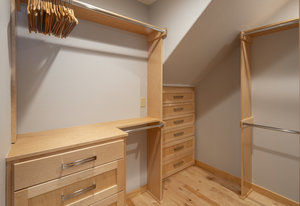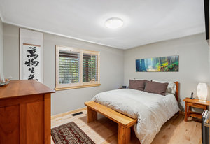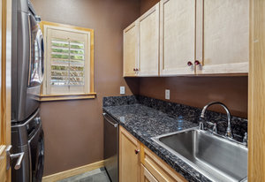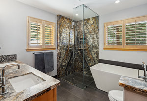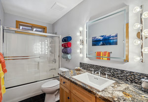 Downstairs, you’ll find two guest bedrooms and a full bath, along with a luxurious primary suite designed with both comfort and practicality in mind. The suite features direct access to the lower deck through a sliding glass door, a spacious walk-in closet with custom built-in drawers and organizers, and a spa-inspired bath with heated tile floors, dual vanity, curbless granite slab shower, and soaking tub.