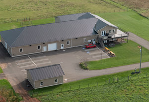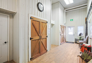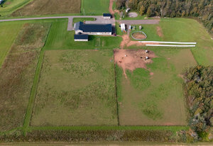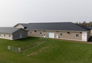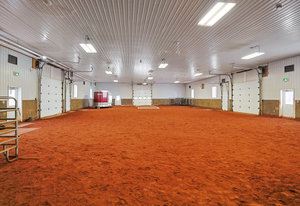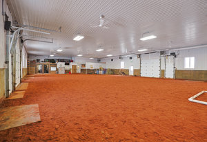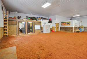 Constructed in 2014 with a recent office extension in March 2020, the main building complex spans nearly 11,000 square feet and includes a luxurious owner's living unit. The property boasts additional land ready for future development, supplemented by outbuildings such as a 7,200 square foot heated indoor riding arena, an equipment shed, and a multifunctional shop/garage.