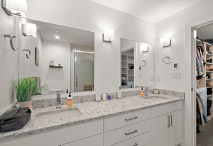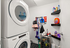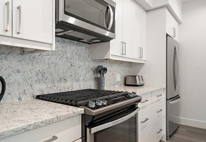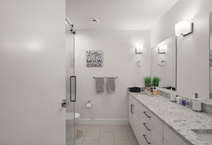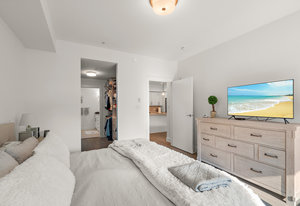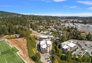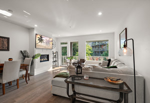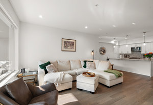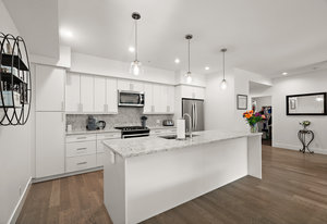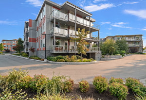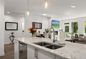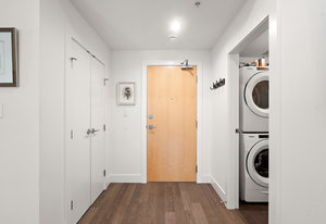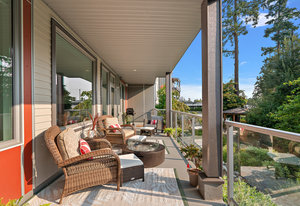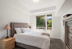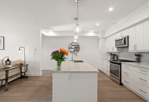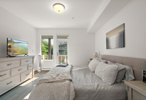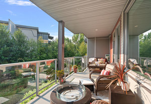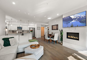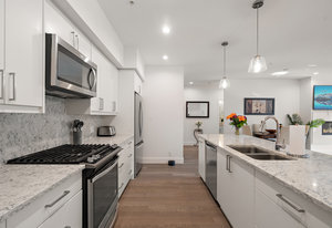 Modern Comfort at Regatta Park. This 2 bed/2 bath home blends style, function, and lifestyle. The bright open layout showcases a gourmet kitchen with quartz counters, premium cabinetry, gas range and oversized island, flowing into a living room centered by a sleek gas fireplace. The primary suite offers a walk-in closet with custom organizers and a spa-inspired ensuite with heated floors and double vanity, while a split-bedroom design provides privacy for guests or a home office. Standout features include an expansive 300+ sq.ft. deck spanning the full width of the home, ideal for morning coffee or evening entertaining. Additionally, there are 2 parking stalls (1 secure underground with bike cage, ...