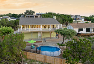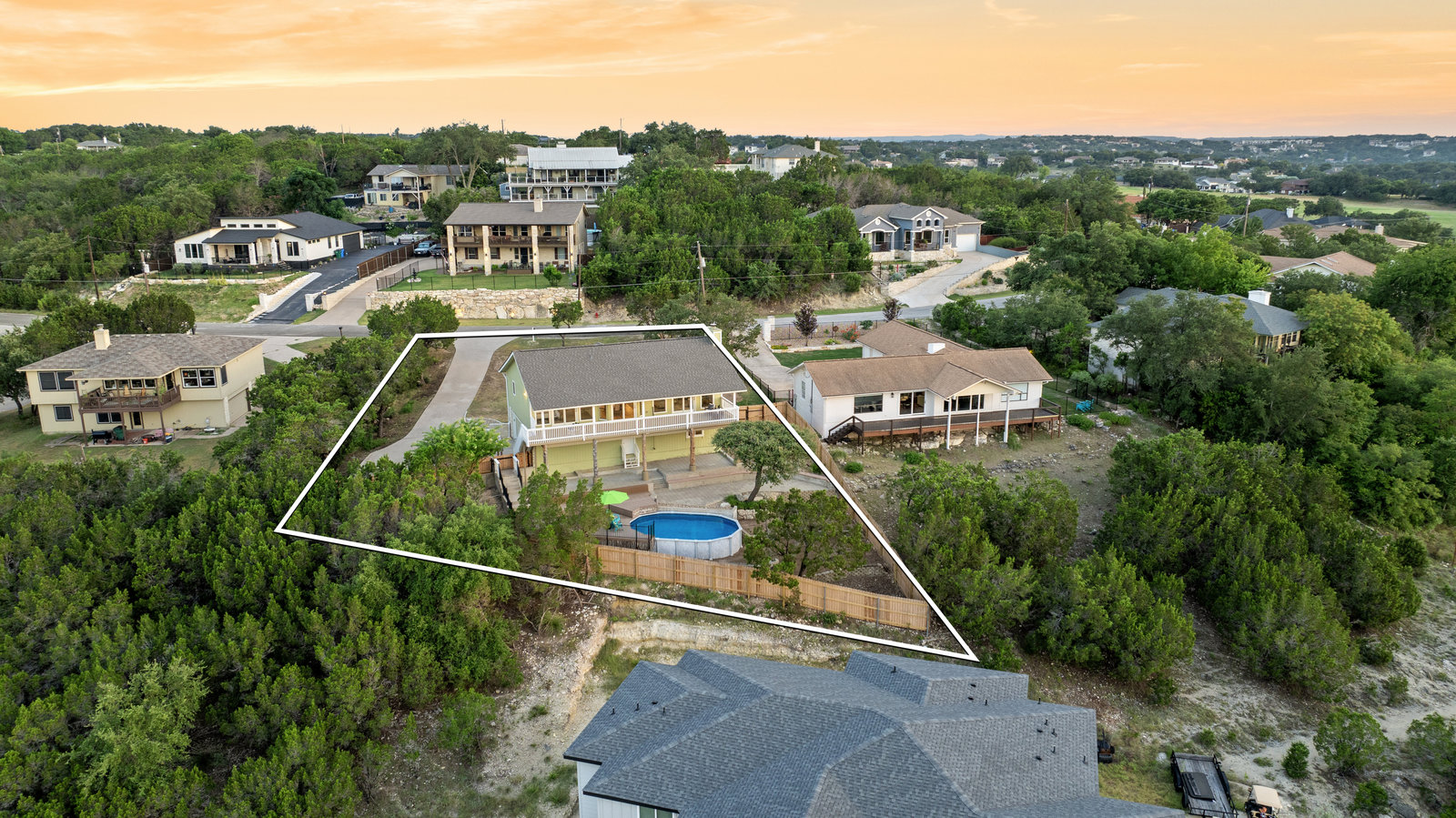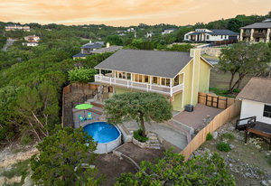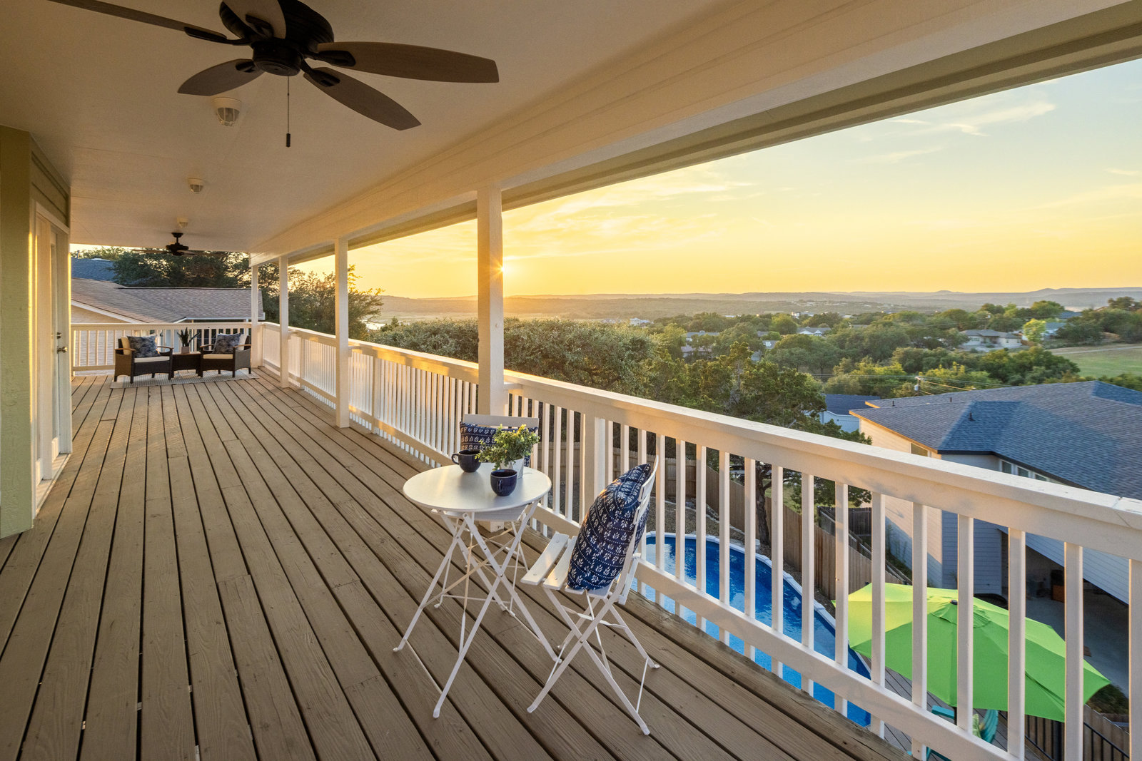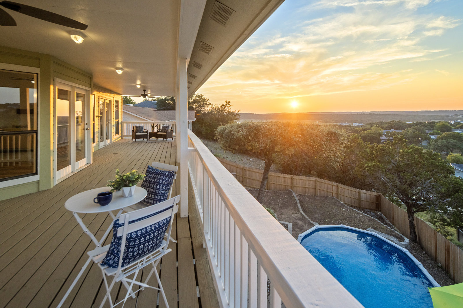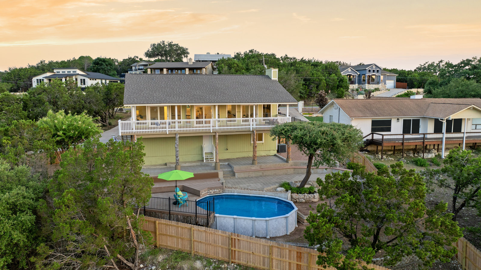 Beautifully updated 3 bedroom, 2.5 bathroom home on a large .336-acre lot with a private pool offering panoramic views of the Lago Vista Golf Course’s 15th fairway and green, Pace Bend Park, Lake Travis, and hill country sunsets! Set back from the street with a private extended driveway and a 2-car side-facing garage, this residence ensures both privacy and convenience. Step inside to an open-concept living space adorned with high vaulted ceilings and abundant natural light. The spacious living area features a modern ceiling fan and a floor-to-ceiling stone fireplace with a custom wood mantel, creating a warm and inviting atmosphere. Adjacent to the living area is a dining space highlighted by a stunning chandelier, perfect for entertaining guests. The chef’s kitchen boasts white cabinetry, quartz countertops, ample storage, and sleek stainless-steel appliances, making it a culinary haven just steps away from the dining area. Upstairs, the primary suite offers a serene retreat with a vaulted ceiling, two walk-in closets, and a private en-suite bath featuring a quartz-topped dual vanity and a luxurious jetted tub/shower combo. Both the living area and primary bedroom have direct access to the covered terrace, where you can unwind underneath the ceiling fans and take in incredible views of the Lago Vista Golf Course’s 15th fairway and green, Pace Bend Park, Lake Travis, and spectacular hill country sunsets. The expansive backyard is an outdoor oasis, complete with a terraced covered patio and composite decking that surrounds the private above-ground pool. The extended driveway provides ample parking space for RVs, boats, or jet skis, accommodating all your outdoor recreational needs. Other features include a recent roof, interior/exterior paint, lighting, appliances, fencing, drainage, water heater, and more. Situated on a large lot, this home offers unparalleled privacy and a prime location to enjoy stunning views and serene living. Schedule a showing today!