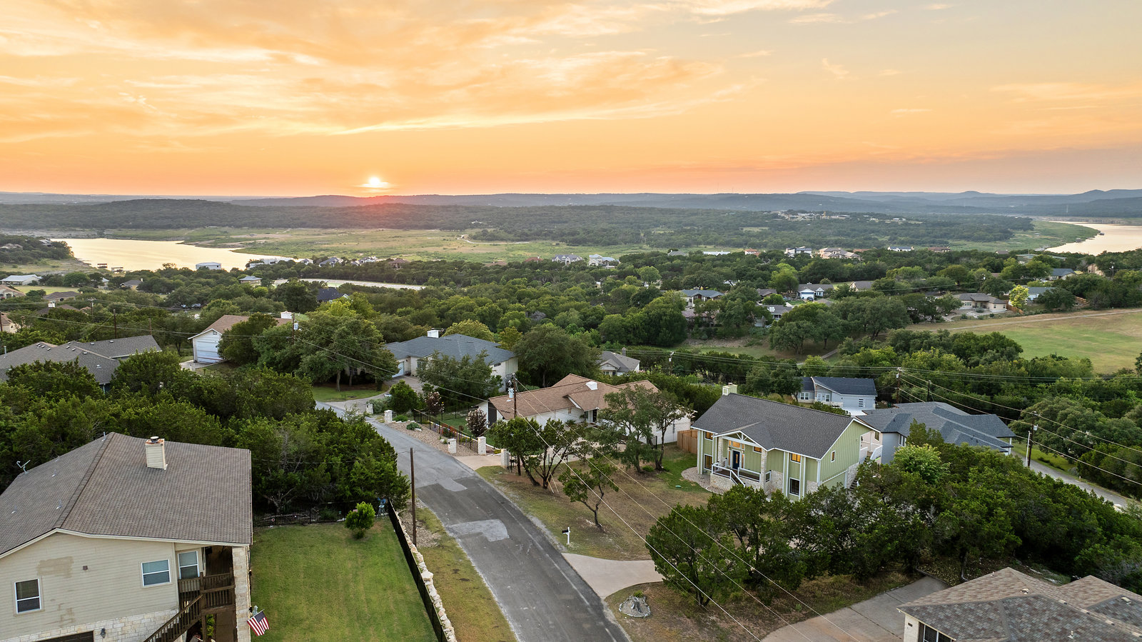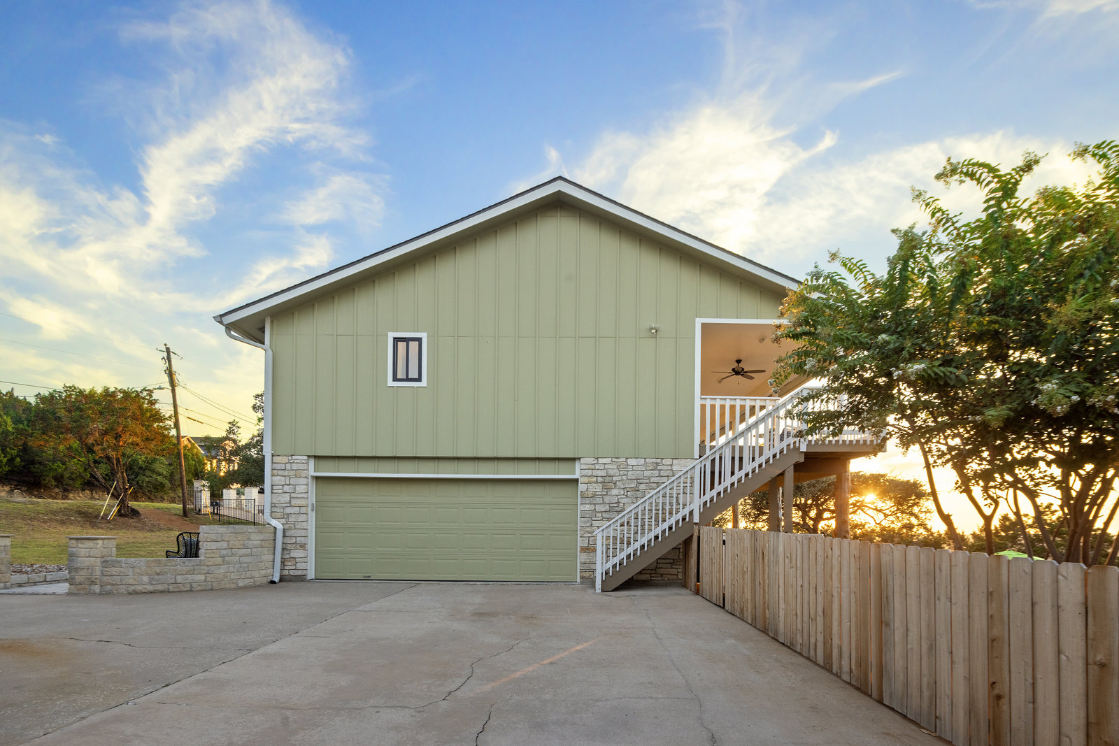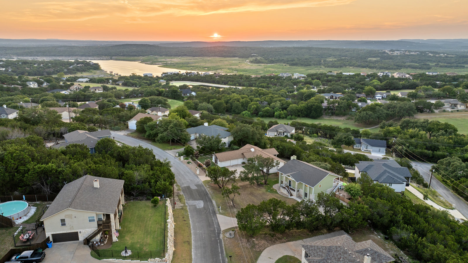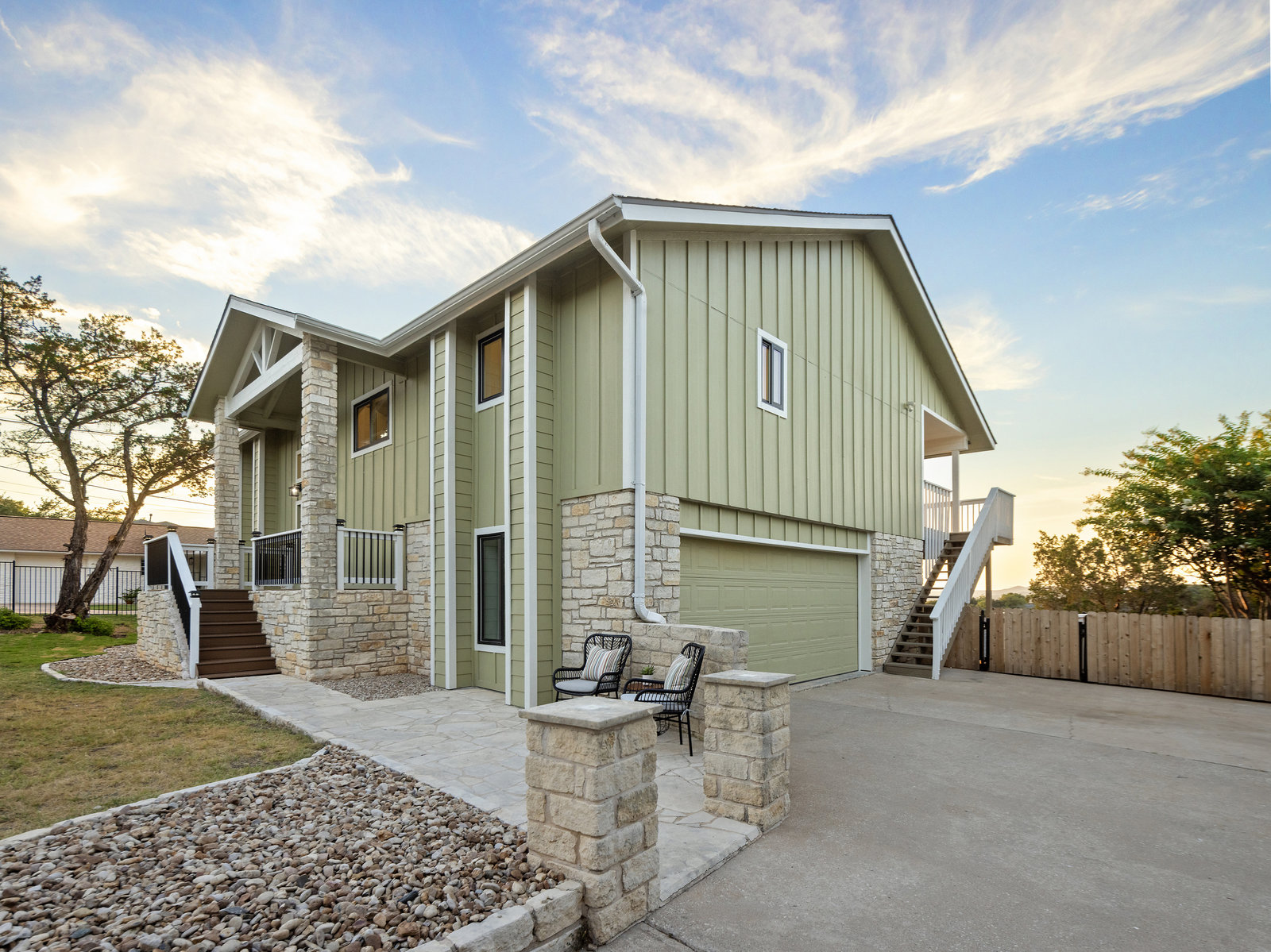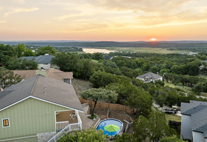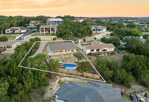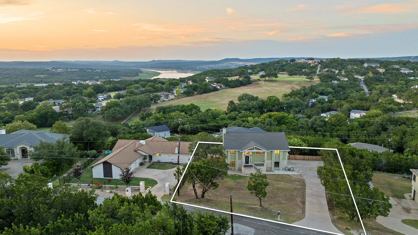 Beautifully updated 3 bedroom, 2.5 bathroom home on a large .336-acre lot with a private pool offering panoramic views of the Lago Vista Golf Course’s 15th fairway and green, Pace Bend Park, Lake Travis, and hill country sunsets! Set back from the street with a private extended driveway and a 2-car side-facing garage, this residence ensures both privacy and convenience. Step inside to an open-concept living space adorned with high vaulted ceilings and abundant natural light. The spacious living area features a modern ceiling fan and a floor-to-ceiling stone fireplace with a custom wood mantel, creating a warm and inviting atmosphere. Adjacent to the living area is a dining space highlighted by a stunning chandelier, perfect for entertaining guests. The chef’s kitchen boasts white cabinetry, quartz countertops, ample storage, and sleek stainless-steel appliances, making it a culinary haven just steps away from the dining area. Upstairs, the primary suite offers a serene retreat with a vaulted ceiling, two walk-in closets, and a private en-suite bath featuring a quartz-topped dual vanity and a luxurious jetted tub/shower combo. Both the living area and primary bedroom have direct access to the covered terrace, where you can unwind underneath the ceiling fans and take in incredible views of the Lago Vista Golf Course’s 15th fairway and green, Pace Bend Park, Lake Travis, and spectacular hill country sunsets. The expansive backyard is an outdoor oasis, complete with a terraced covered patio and composite decking that surrounds the private above-ground pool. The extended driveway provides ample parking space for RVs, boats, or jet skis, accommodating all your outdoor recreational needs. Other features include a recent roof, interior/exterior paint, lighting, appliances, fencing, drainage, water heater, and more. Situated on a large lot, this home offers unparalleled privacy and a prime location to enjoy stunning views and serene living. Schedule a showing today!