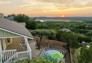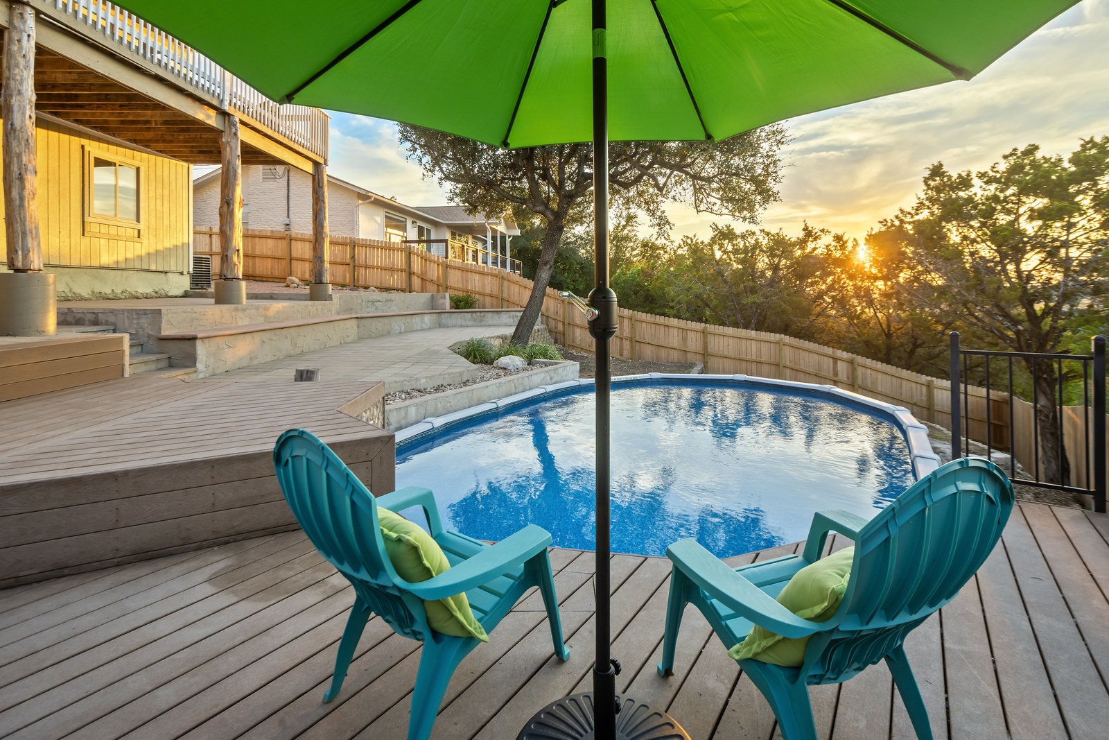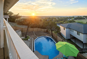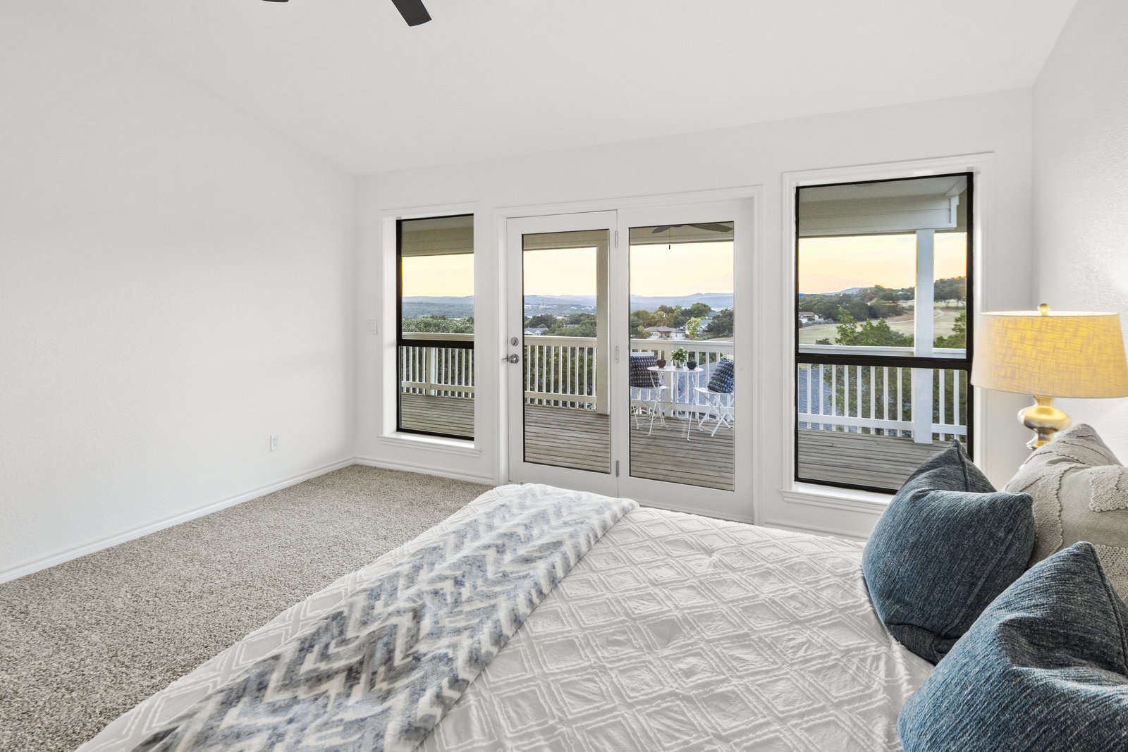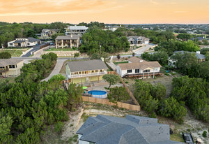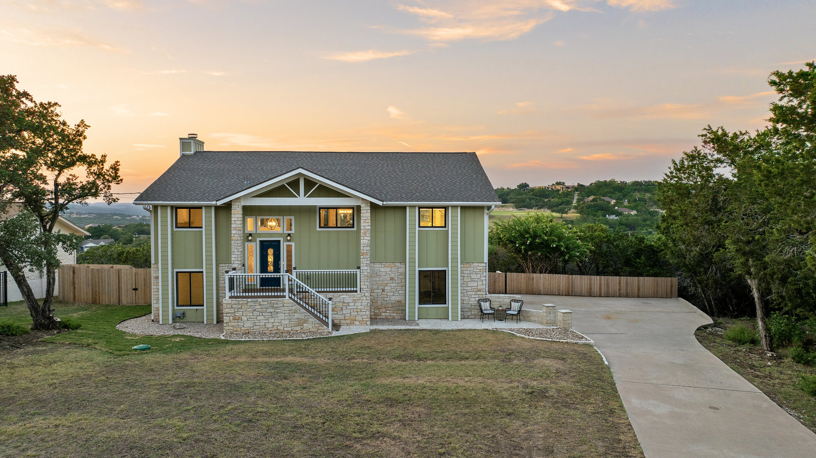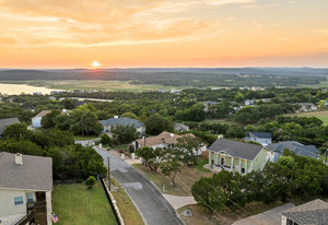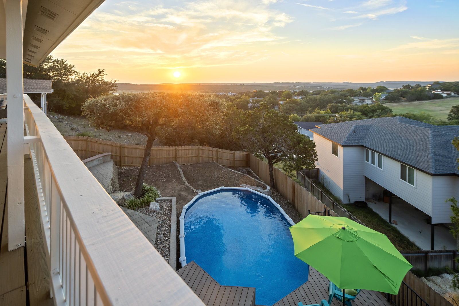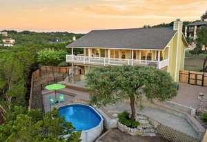 Beautifully updated 3 bedroom, 2.5 bathroom home on a large .336-acre lot with a private pool offering panoramic views of the Lago Vista Golf Course’s 15th fairway and green, Pace Bend Park, Lake Travis, and hill country sunsets! Set back from the street with a private extended driveway and a 2-car side-facing garage, this residence ensures both privacy and convenience. Step inside to an open-concept living space adorned with high vaulted ceilings and abundant natural light. The spacious living area features a modern ceiling fan and a floor-to-ceiling stone fireplace with a custom wood mantel, creating a warm and inviting atmosphere. Adjacent to the living area is a dining space highlighted by a stunning chandelier, perfect for entertaining guests. The chef’s kitchen boasts white cabinetry, quartz countertops, ample storage, and sleek stainless-steel appliances, making it a culinary haven just steps away from the dining area. Upstairs, the primary suite offers a serene retreat with a vaulted ceiling, two walk-in closets, and a private en-suite bath featuring a quartz-topped dual vanity and a luxurious jetted tub/shower combo. Both the living area and primary bedroom have direct access to the covered terrace, where you can unwind underneath the ceiling fans and take in incredible views of the Lago Vista Golf Course’s 15th fairway and green, Pace Bend Park, Lake Travis, and spectacular hill country sunsets. The expansive backyard is an outdoor oasis, complete with a terraced covered patio and composite decking that surrounds the private above-ground pool. The extended driveway provides ample parking space for RVs, boats, or jet skis, accommodating all your outdoor recreational needs. Other features include a recent roof, interior/exterior paint, lighting, appliances, fencing, drainage, water heater, and more. Situated on a large lot, this home offers unparalleled privacy and a prime location to enjoy stunning views and serene living. Schedule a showing today!