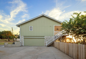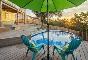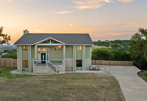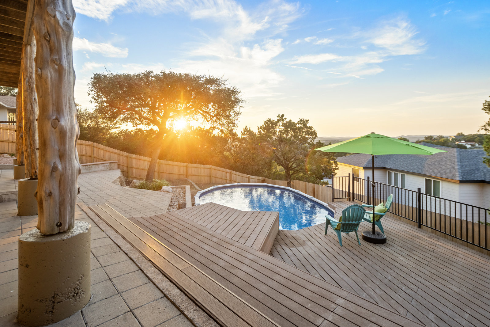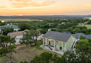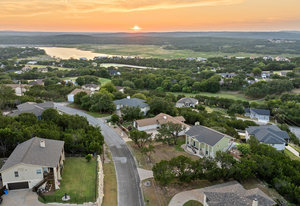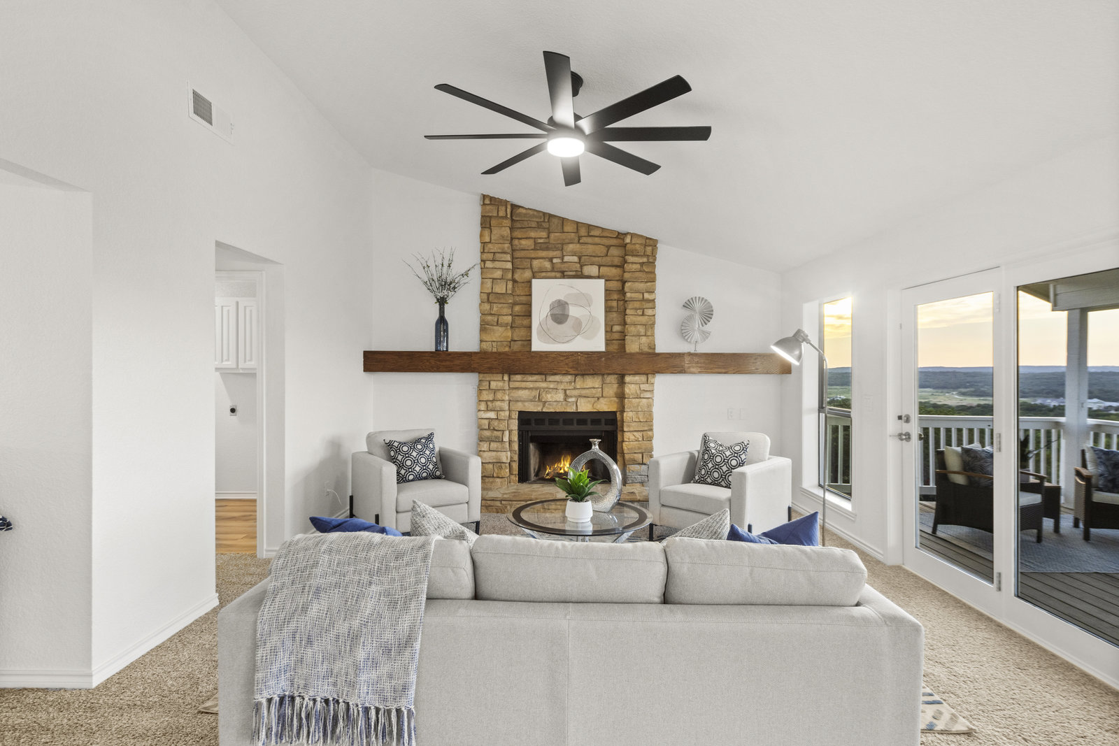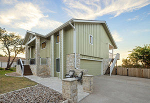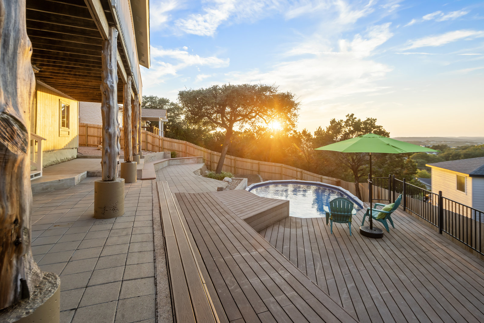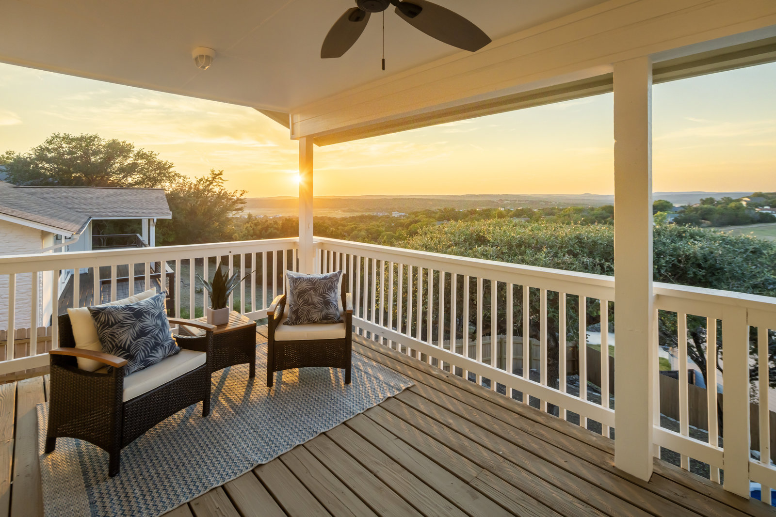 Beautifully updated 3 bedroom, 2.5 bathroom home on a large .336-acre lot with a private pool offering panoramic views of the Lago Vista Golf Course’s 15th fairway and green, Pace Bend Park, Lake Travis, and hill country sunsets! Set back from the street with a private extended driveway and a 2-car side-facing garage, this residence ensures both privacy and convenience. Step inside to an open-concept living space adorned with high vaulted ceilings and abundant natural light. The spacious living area features a modern ceiling fan and a floor-to-ceiling stone fireplace with a custom wood mantel, creating a warm and inviting atmosphere. Adjacent to the living area is a dining space highlighted by a stunning chandelier, perfect for entertaining guests. The chef’s kitchen boasts white cabinetry, quartz countertops, ample storage, and sleek stainless-steel appliances, making it a culinary haven just steps away from the dining area. Upstairs, the primary suite offers a serene retreat with a vaulted ceiling, two walk-in closets, and a private en-suite bath featuring a quartz-topped dual vanity and a luxurious jetted tub/shower combo. Both the living area and primary bedroom have direct access to the covered terrace, where you can unwind underneath the ceiling fans and take in incredible views of the Lago Vista Golf Course’s 15th fairway and green, Pace Bend Park, Lake Travis, and spectacular hill country sunsets. The expansive backyard is an outdoor oasis, complete with a terraced covered patio and composite decking that surrounds the private above-ground pool. The extended driveway provides ample parking space for RVs, boats, or jet skis, accommodating all your outdoor recreational needs. Other features include a recent roof, interior/exterior paint, lighting, appliances, fencing, drainage, water heater, and more. Situated on a large lot, this home offers unparalleled privacy and a prime location to enjoy stunning views and serene living. Schedule a showing today!